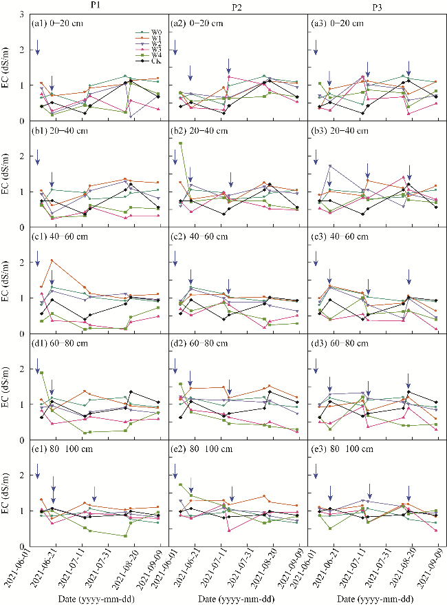 Fig. 6 Soil EC dynamics for different leaching amount and period treatments in 2021. (a1-a3), 0-20 cm; (b1-b3), 20-40 cm; (c1-c3), 40-60 cm; (d1-d3), 60-80 cm; (e1-e3), 80-100 cm. Arrow means the leaching date. |