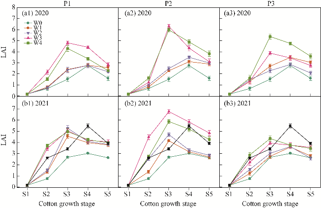 Fig. 8 Effects of different leaching amount and period treatments on leaf area index (LAI) of cotton in 2020 (a1-a3) and 2021 (b1-b3) |