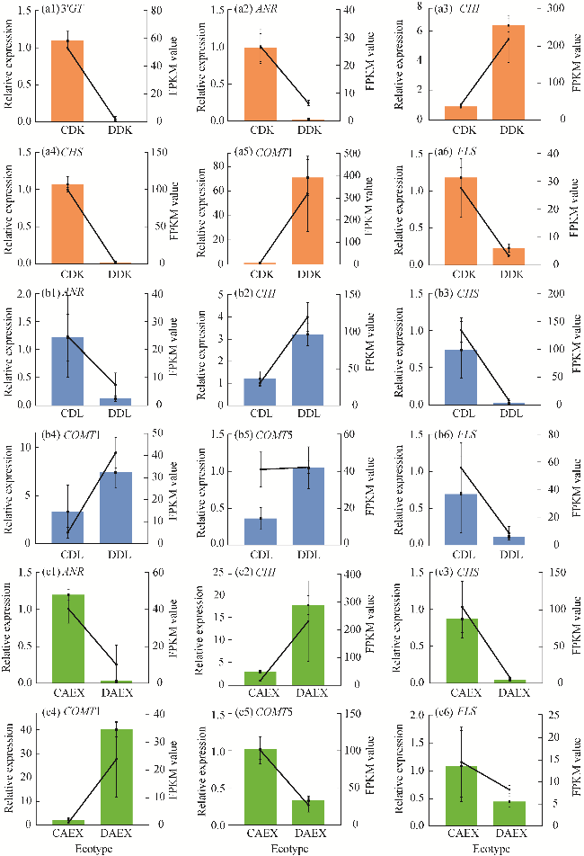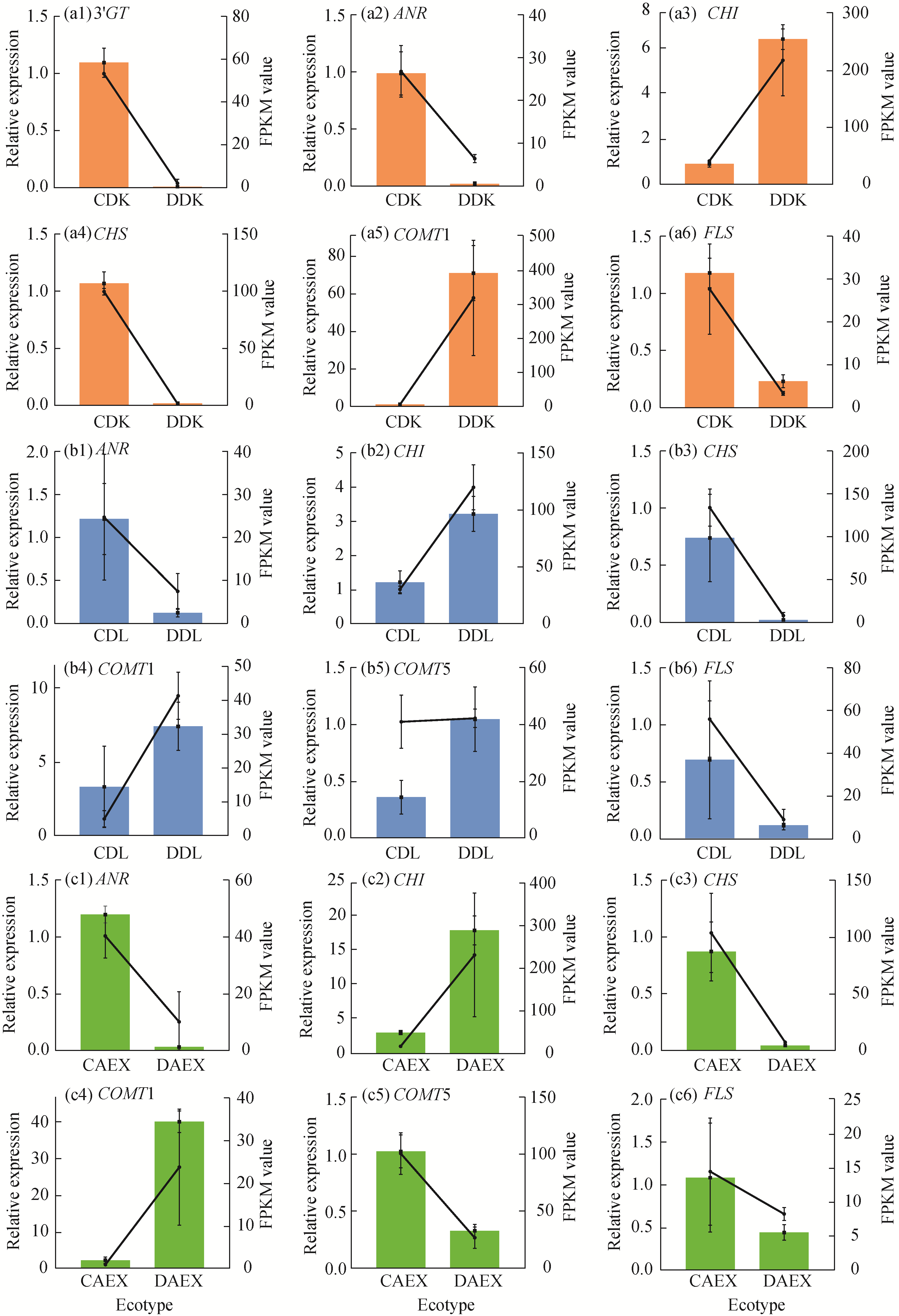 Fig. 6 Quantitative real-time polymerase chain reaction (qRT-PCR) validation of the transcriptome data in DK (a1-a6), DL (b1-b6) and AEX (c1-c6) ecotypes of sandrice. The line graph and the histogram with error bars present the relative expression calculated by the 2−ΔΔCt method and fragments per kilobase million (FPKM) value generated by ribonucleic acid sequence (RNA-Seq), respectively. |