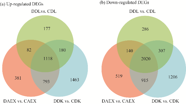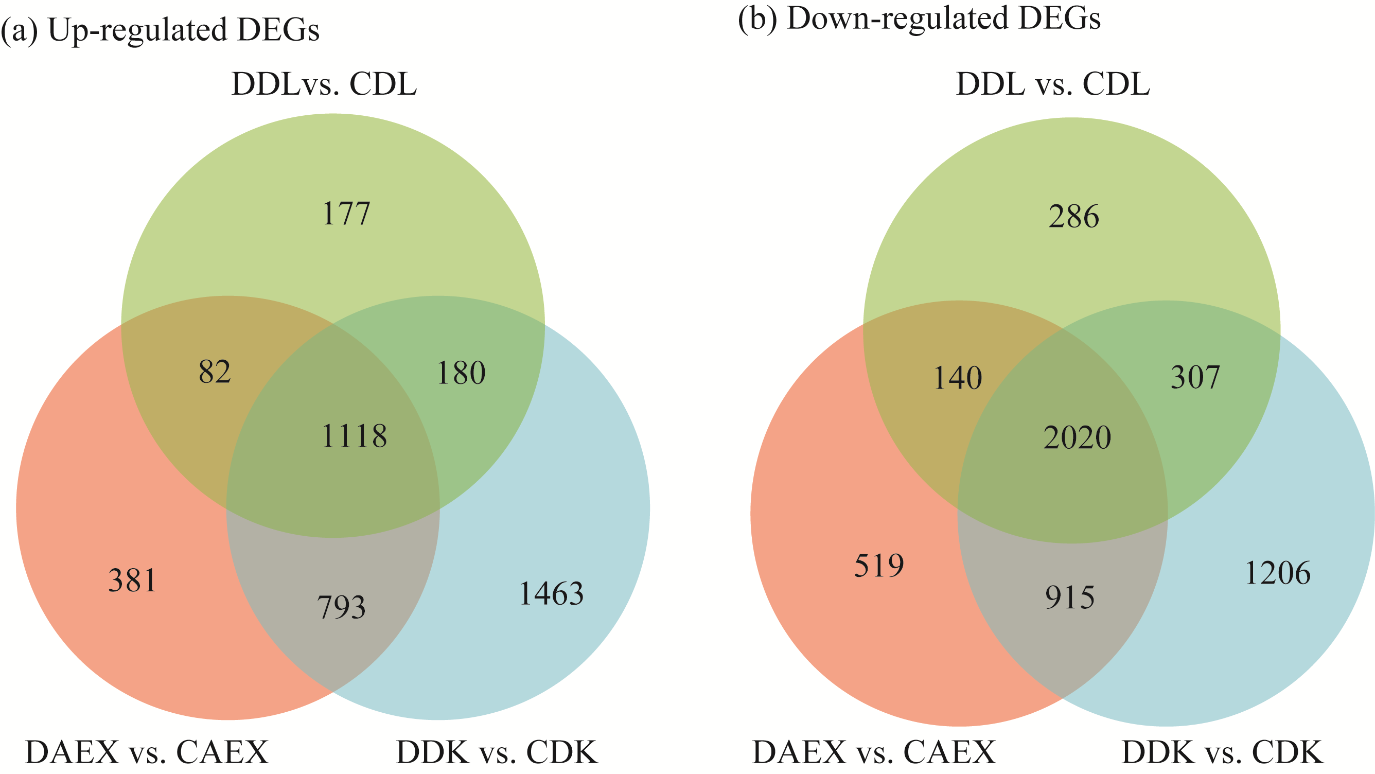 Fig. S3 Venn diagram showing overlap of up-regulated differentially expressed genes (DEGs) (a) and down-regulated DEGs (b) in the three ecotypes |