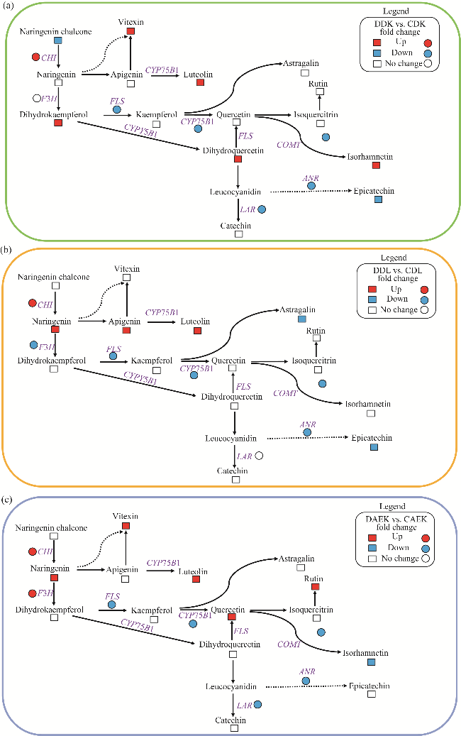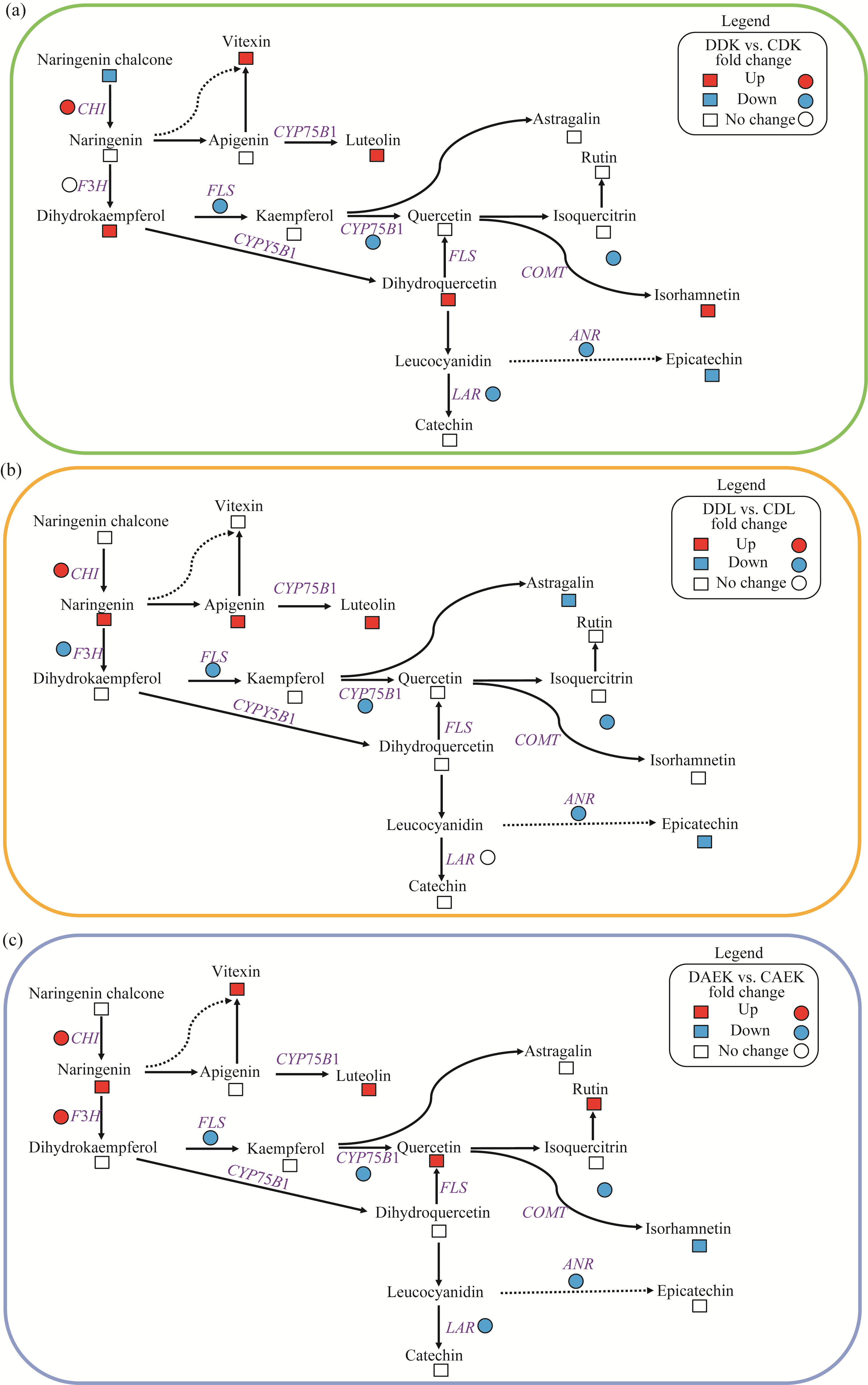 Fig. 5 Flavonoid biosynthesis pathway in response to drought stress in DK (a), DL (b), and AEX (c) ecotypes of sandrice. The heatmap colored red and blue indicates up-regulation and down-regulation of structural genes and flavonoid metabolites, respectively. The square and circle presented structural gene and flavonoid metabolites, respectively. |