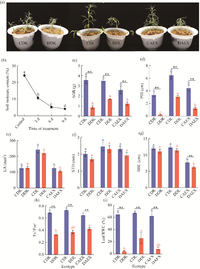 Fig. 1 Effects of drought stress on the morphological traits and physiological indicators in DK (Dengkou County), DL (Dulan County), and AEX (Aerxiang Village) ecotypes. (a), phenotype of DK, DL, and AEX after drought stress and control treatments (CDK, CDL, and CAEX); (b), soil moisture content; (c), above-ground biomass (AGB); (d), plant height increase (PHI); (e), leaf area (LA); (f), stem diameter (STD); (g), basal branch length (BBL); (h), Fv'/Fm' value at vegetative stage; (i), leaf relative water content (RWC). DDK, DDL, and DAEX represented the drought stress treatments of DK, DL and AEX, respectively. Bars are standard errors. Within the same treatment (control or drought), different lowercase letters indicated significant difference at P<0.050 level. Asterisks on shoulder lines indicated statistically significant differences between control and drought of the same ecotype. *, P<0.050 level; **, P<0.010 level. The abbreviations are the same in the following figures and tables. |