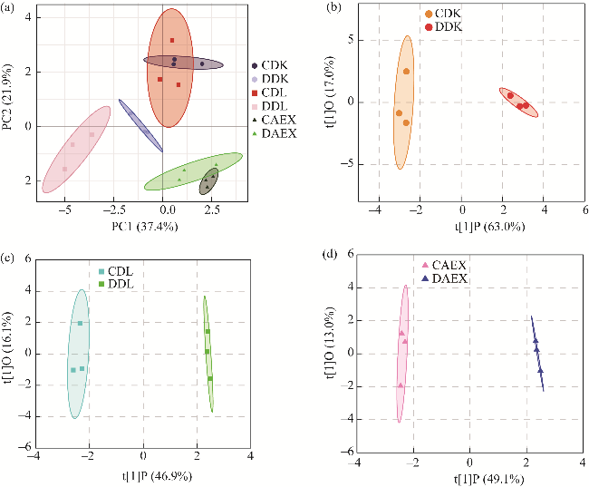 Fig. S1 Significant difference analysis of flavonoid-targeting metabolites in above-ground tissue of sandrice. (a), principal component analysis (PCA); (b-d), orthogonal partial least squares discriminant analysis (OPLS-DA). PC1 represents the first principal component, and PC2 represents the second principal component. t[1]P represents the predicted principal component score of the first principal component, showing the differences between sample groups, and t[1]O represents the orthogonal principal component score of the second principal component, showing the differences within sample groups. |