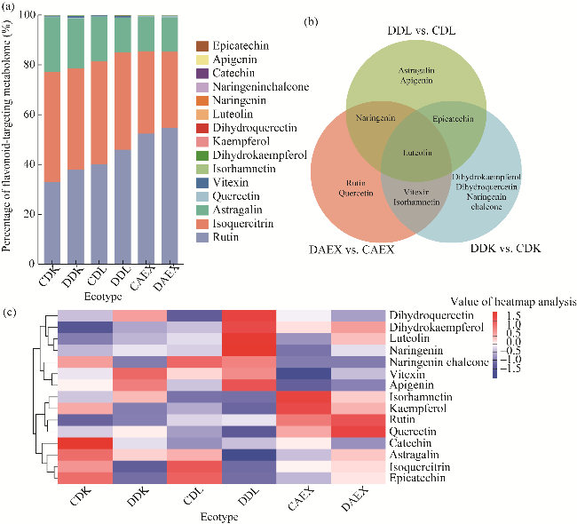 Fig. 2 Flavonoid-targeting metabolites identified in above-ground tissue of sandrice. (a), percentage of flavonoid-targeting metabolome; (b), Venn of metabolite significance analysis; (c), hierarchical cluster heatmap analysis of metabolites. |