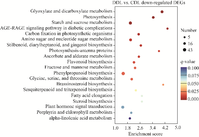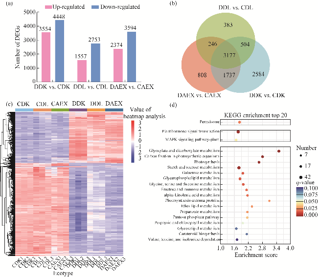Fig. 3 Description of differentially expressed genes (DEGs) in transcriptome data of the three ecotypes of sandrice in response to drought. (a), number of DEGs; (b), Venn diagram showing overlap of DEGs in the three ecotypes; (c), heatmap analysis of 3177 DEGs in Figure 3b; (d), Kyoto encyclopedia of genes and genomes (KEGG) enrichment analysis bubble map. Dot size represents the number of distinct genes, and dot color reflects the q-value. |