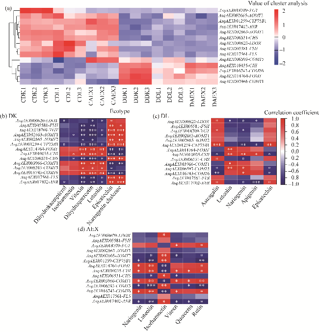 Fig. 4 Cluster analysis and correlation analysis between DEGs and differentially accumulated flavonoids (DAFs). (a), genes related to flavonoid synthesis in 18 samples. LDOX, leucoanthocyanidin dioxygenase; F5H, cytochrome P450 84A1; 3'GT, anthocyanin 3'-O-beta-glucosyltransferase; AOMT, flavonoid 3',5'-methyltransferase; CYP75B1, flavonoid 3'-monooxygenase; FOMT, flavonoid 3'-O-methyltransferase; CHI, chalcone isomerase; CHS, chalcone synthase; COMT, caffeic acid 3-O-methyltransferase; FLS, flavonol synthase; ANR, anthocyanidin reductase. (b-d), correlation analysis between DEGs and DAFs of DK (b), DL (c), and AEX (d). ***, **, and * represent significant differences at P<0.001, P<0.010, and P<0.050 levels, respectively. The abbreviations are the same in the following figures. |