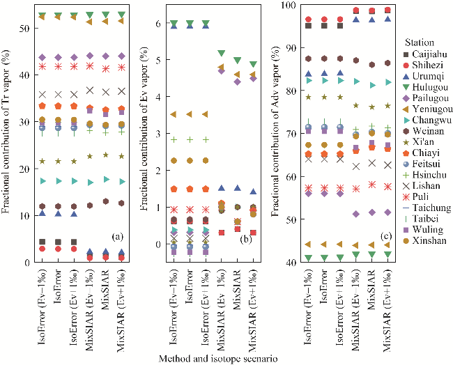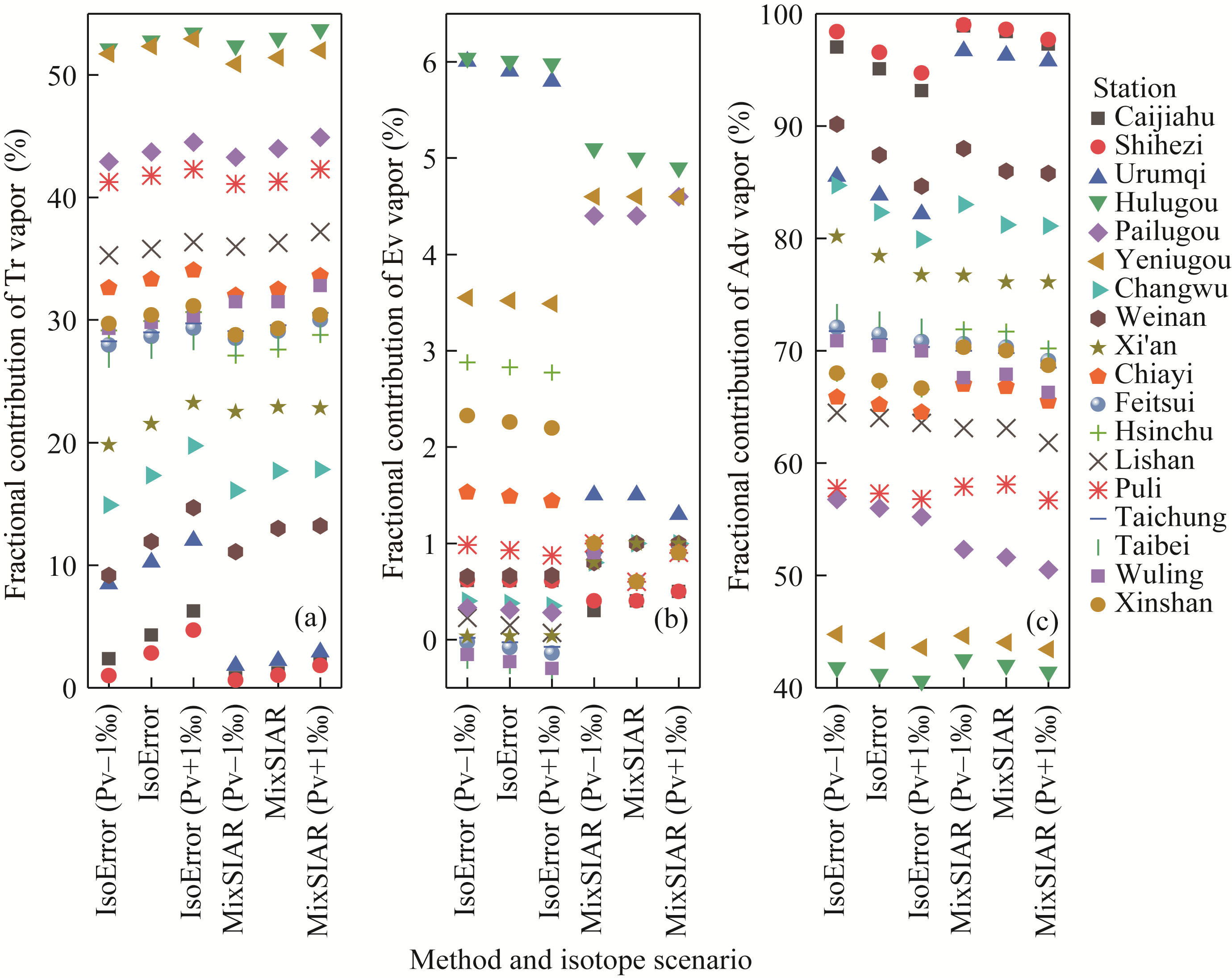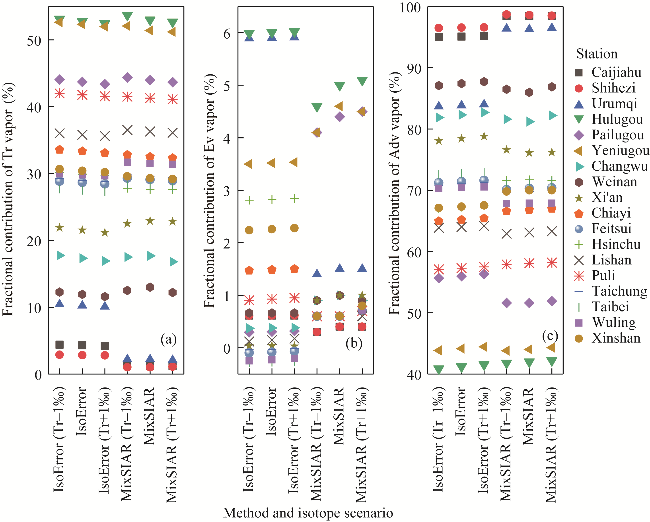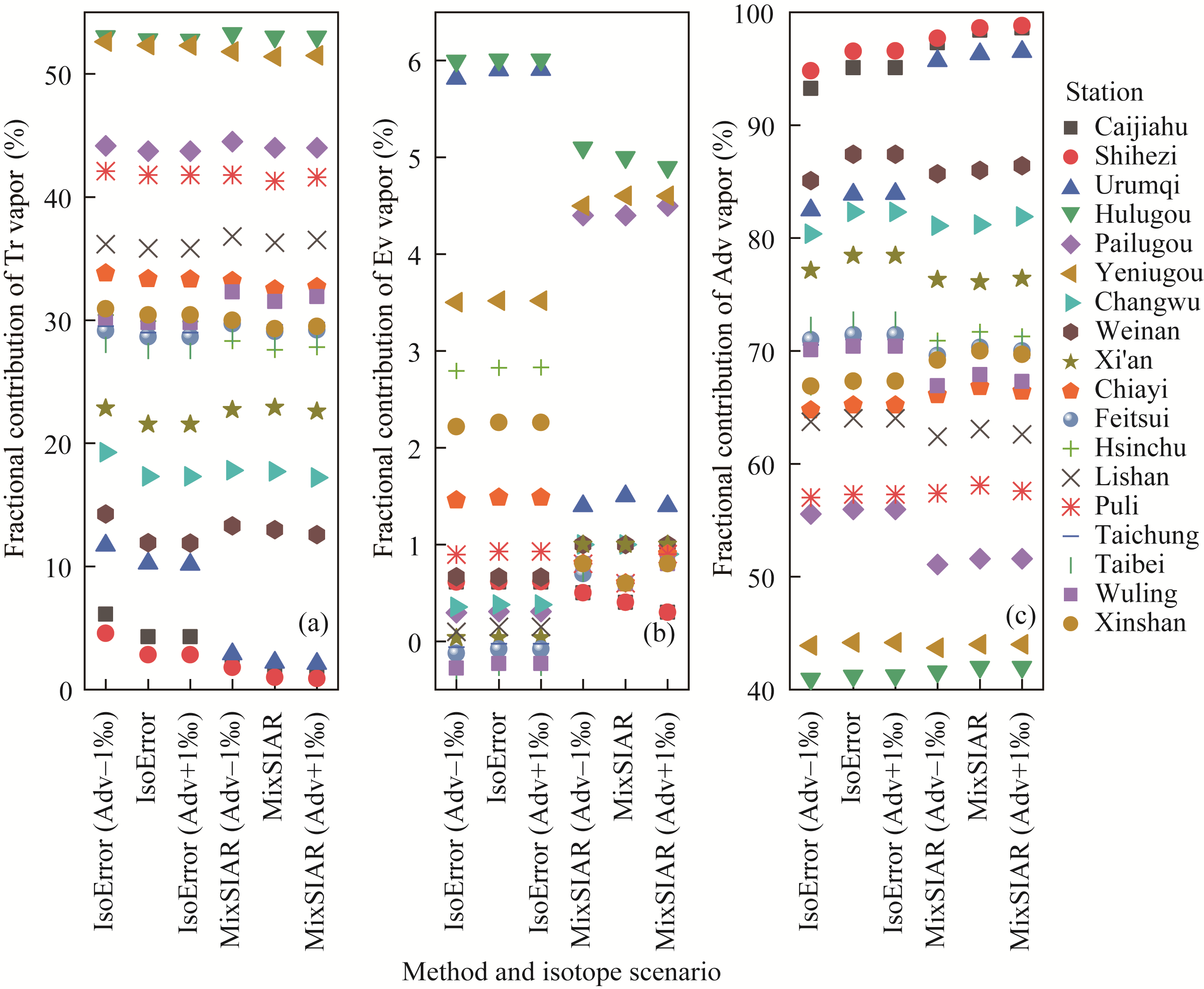 Fig. 10 Sensitivity of fractional contributions for each vapor source when δ2H value in Adv vapor increases by 1‰ (+1‰) or decreases by 1‰ (-1‰) using IsoError and MixSIAR methods. (a), Tr vapor; (b), Ev vapor; (c), Adv vapor. |