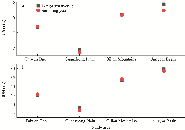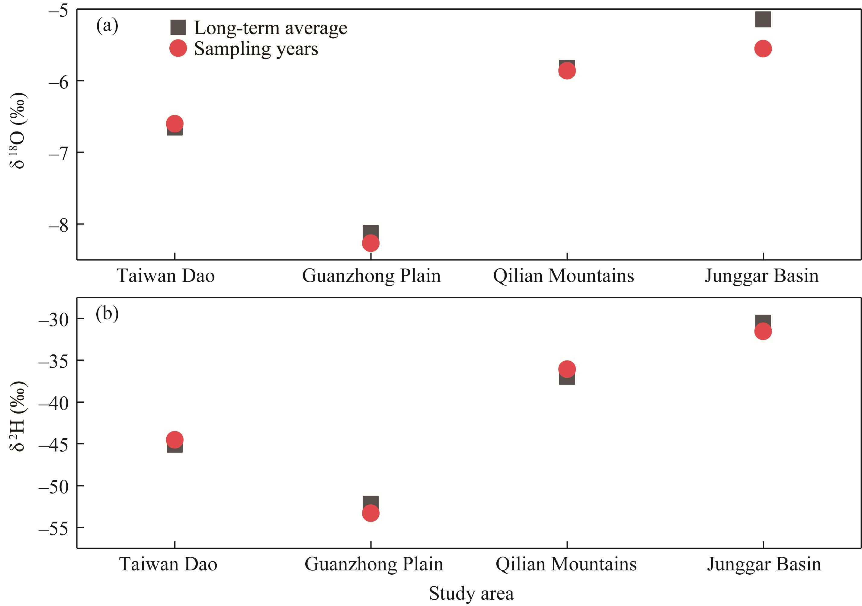 Fig. 2 Precipitation-weighted oxygen (δ18O; a) and hydrogen (δ2H; b) isotopes in summer months from May to September during long-term average (1979-2020) and sampling years in the four areas |