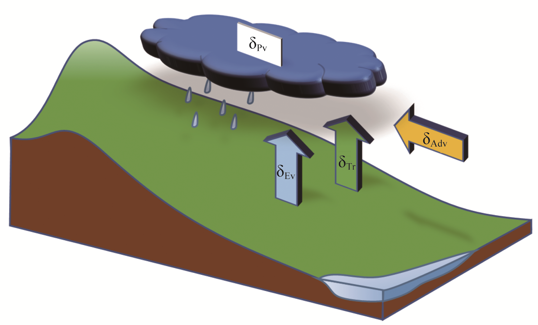 Fig. 3 Schematic of isotope-based three-component mixing model. Three arrows show the isotope compositions of three vapor sources, i.e., advection (δAdv), transpiration (δTr), and surface evaporation (δEv). Isotope composition of precipitating vapor is marked as δPv. |