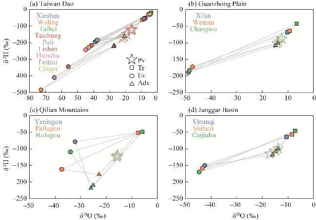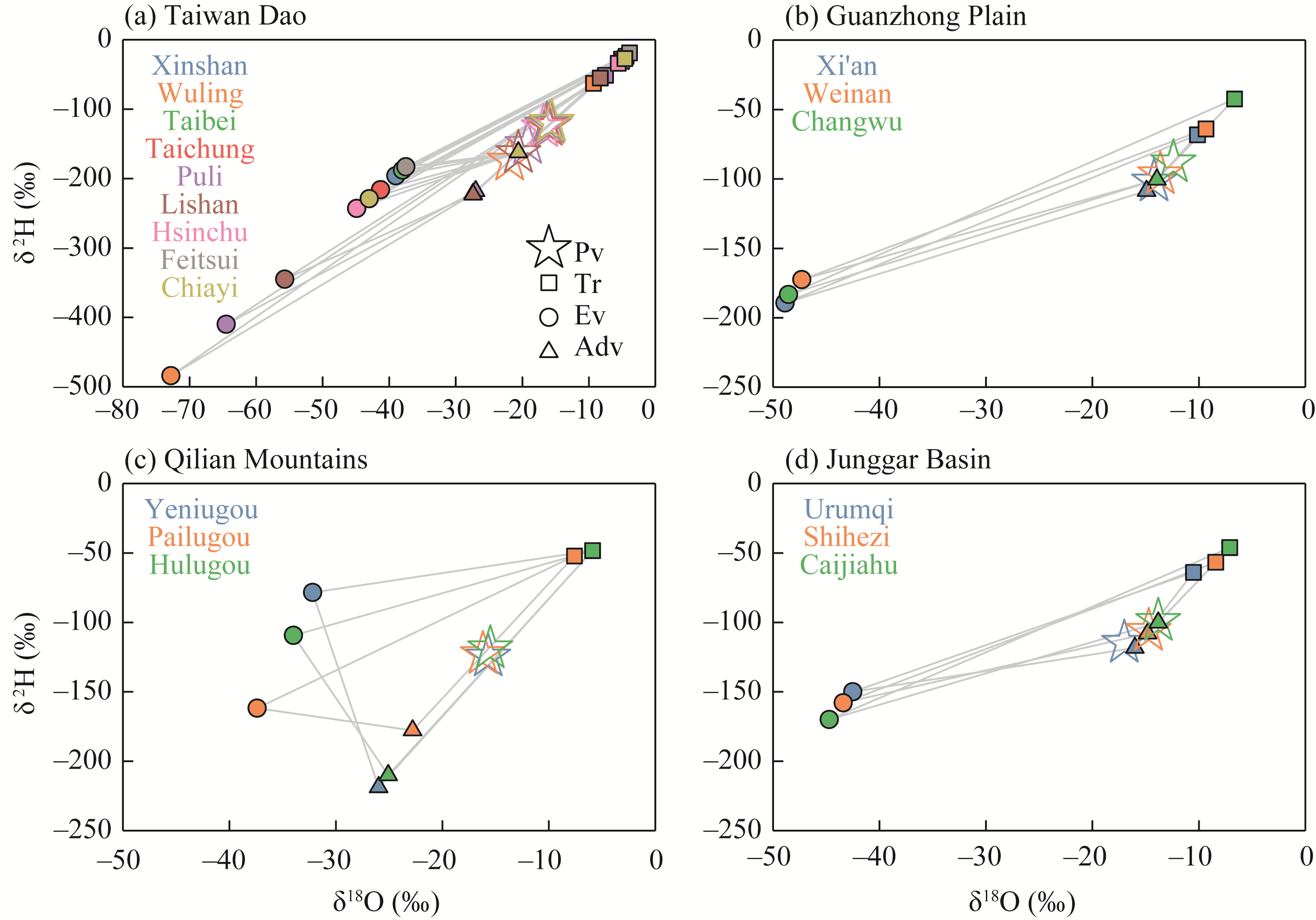 Fig. 4 Relationship between stable hydrogen (δ2H) and oxygen (δ18O) isotope compositions of Pv (precipitating vapor), Tr (transpiration), Ev (surface evaporation), and Adv (advection) vapors for different sampling stations in the four study areas. (a), Taiwan Dao; (b), Guanzhong Plain; (c), Qilian Mountains; (d), Junggar Basin. The symbols of δ2H and δ18O isotope compositions correspond to the sampling stations with the same color. The abbreviations are the same as in the following figures. |