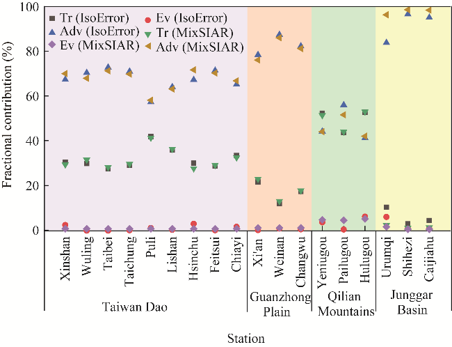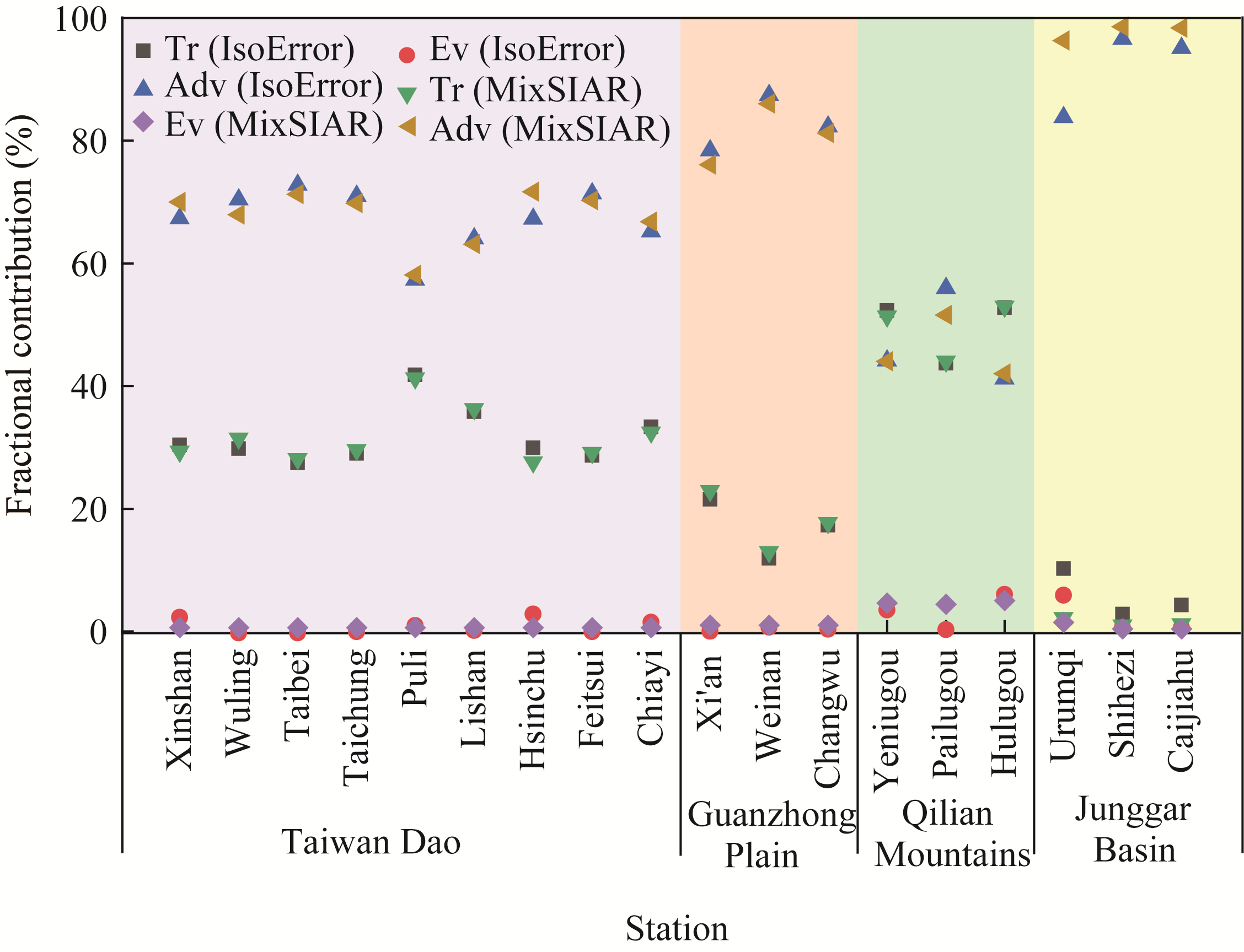 Fig. 5 Fractional contributions of Tr, Ev, and Adv vapors for each sampling station using IsoError and MixSIAR methods |