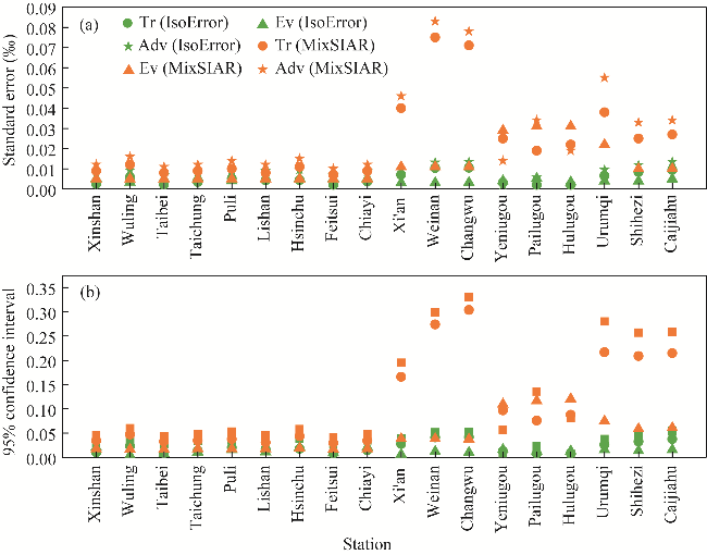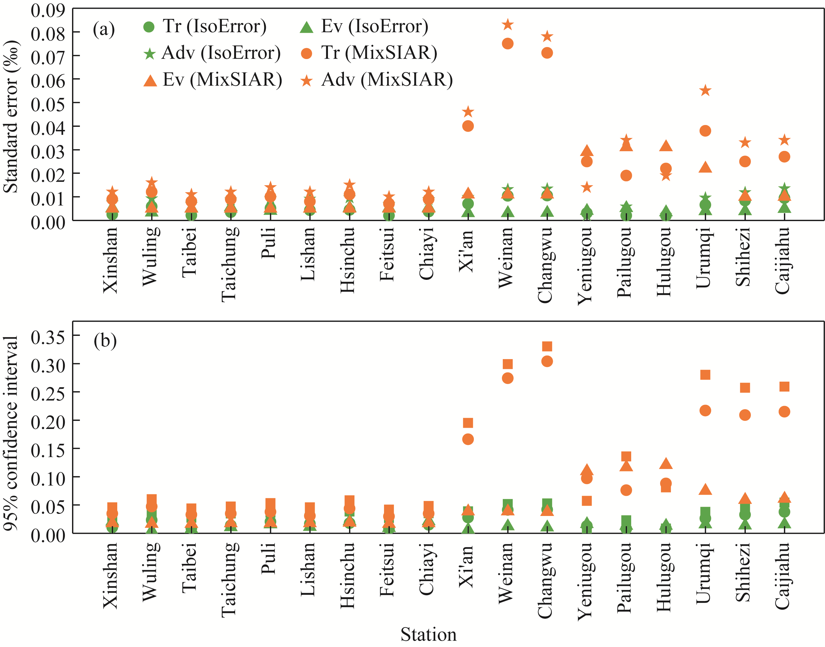 Fig. 6 Standard errors (a) and 95% confidence intervals (b) of Tr, Ev, and Adv vapors for each sampling station using IsoError and MixSIAR methods |