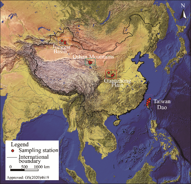 Fig. 1 Sampling stations in China. Four typical sampling areas are marked in squares, i.e., the Taiwan Dao (purple), the Guanzhong Plain (red), the Qilian Mountains (green), and the Junggar Basin (brown) from eastern coastline to western inland in China. Note that the figure is based on the standard map (GS(2020)4619) of the Map Service System (https://bzdt.ch.mnr.gov.cn/), and the standard map has not been modified. |
