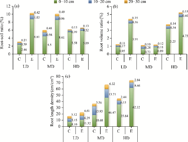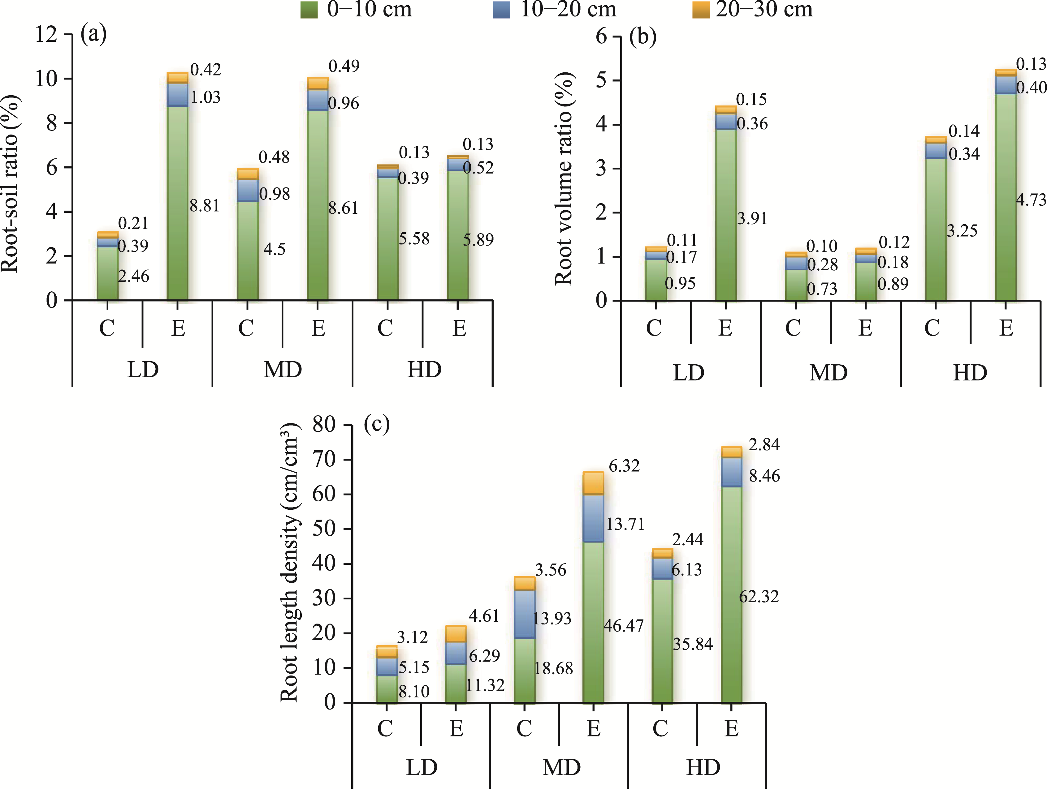 Fig. 4 Root-soil ratio (a), root volume ratio (b), and root length density (c) at different soil depth layers in the three alpine meadow sample plots at different degrees of degradation. C, crack location; E, crack elevation location. |