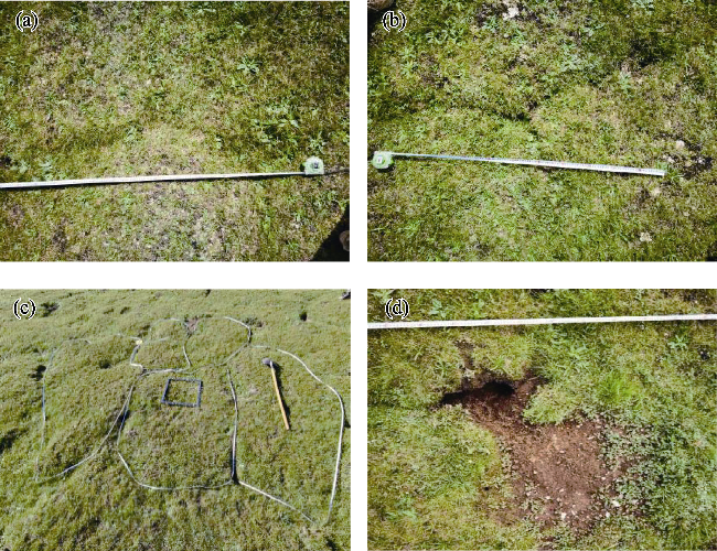 Fig. 5 Fracture morphology in alpine meadows. (a), linear fracture; (b), dendritic fracture; (c) polygonal fracture; (d), rat hole and surrounding bare ground. |