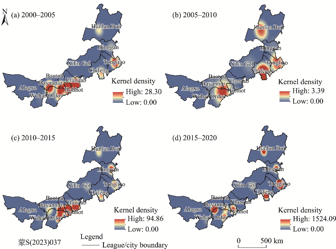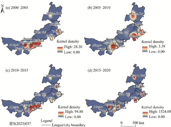 Fig. 4 Kernel density of cultivated land conversion in Inner Mongolia during 2000-2020. (a), 2000-2005; (b), 2005-2010; (c), 2010-2015; (d), 2015-2020. |