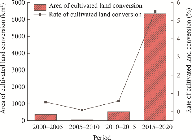 Fig. 2 Area and rate of cultivated land conversion during different periods in Inner Mongolia |