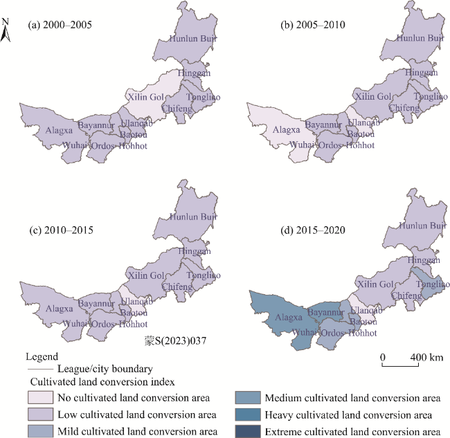 Fig. 3 Spatiotemporal variation of cultivated land conversion index in Inner Mongolia during 2000-2020. (a), 2000-2005; (b), 2005-2010; (c), 2010-2015; (d), 2015-2020. Note that the figures are based on the standard map (蒙 S(2023)037) of the Inner Mongolia Autonomous Region Department of Natural Resources (https://zrzy.nmg. gov.cn/bsfw/bzdt/nmgzzqbzdt/), and the standard map has not been modified. |