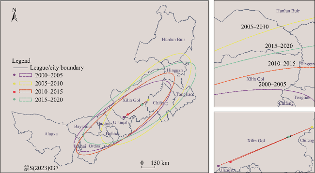 Fig. 5 Standard deviational ellipses and center of gravity migration trajectories of cultivated land conversion in Inner Mongolia from 2000 to 2020. The center of gravity migration arrows begin from 2005 to 2010 and shift from a northeastern to northwestern direction from 2005 to 2010, a northwestern to northeastern direction from 2010 to 2015, and a northwestern direction from 2015 to 2020. |