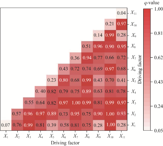 Fig. 6 Interactive detection of influencing factors of cultivated land conversion. The explanation of driving factors is shown in Table 3. |