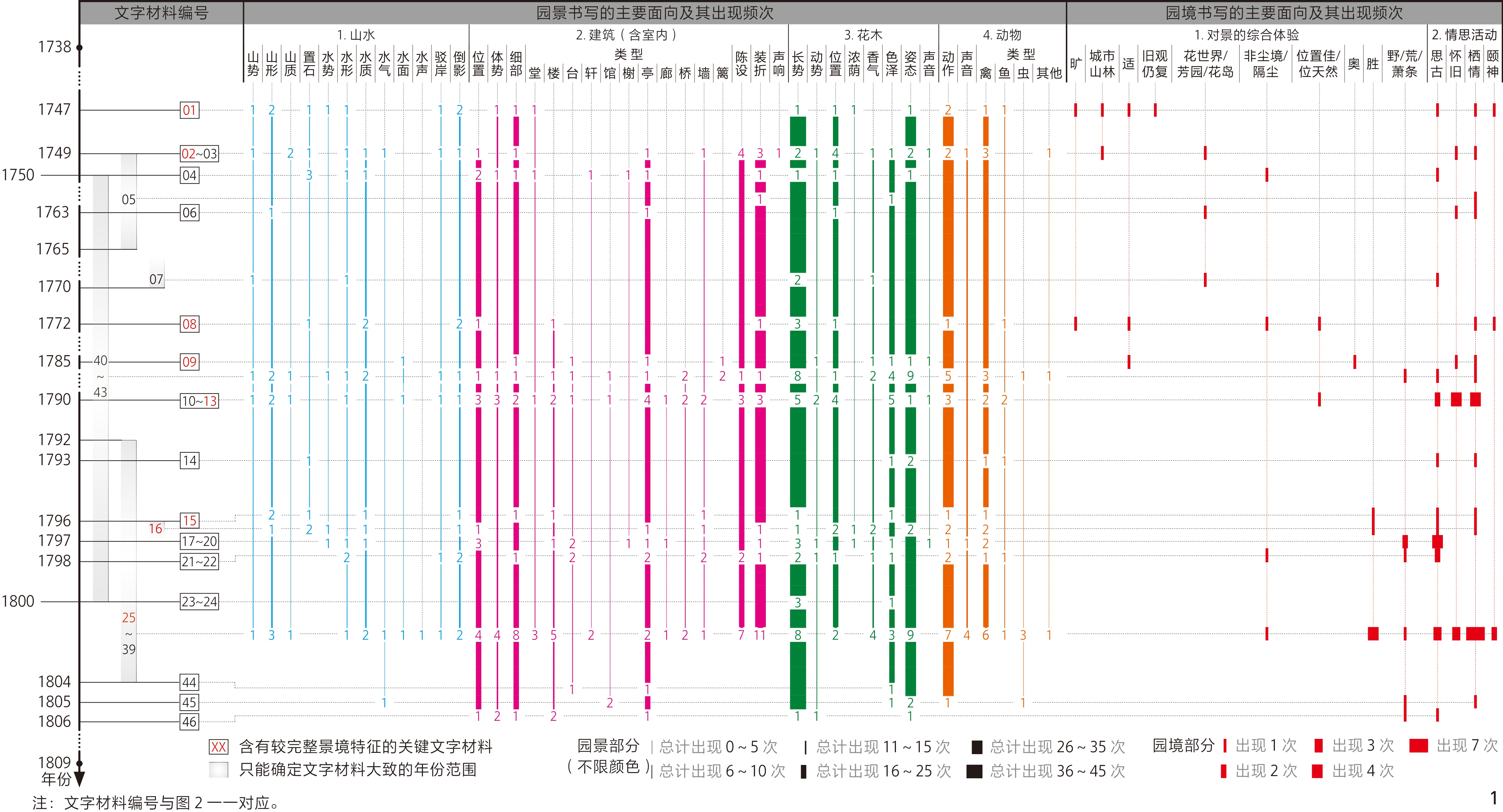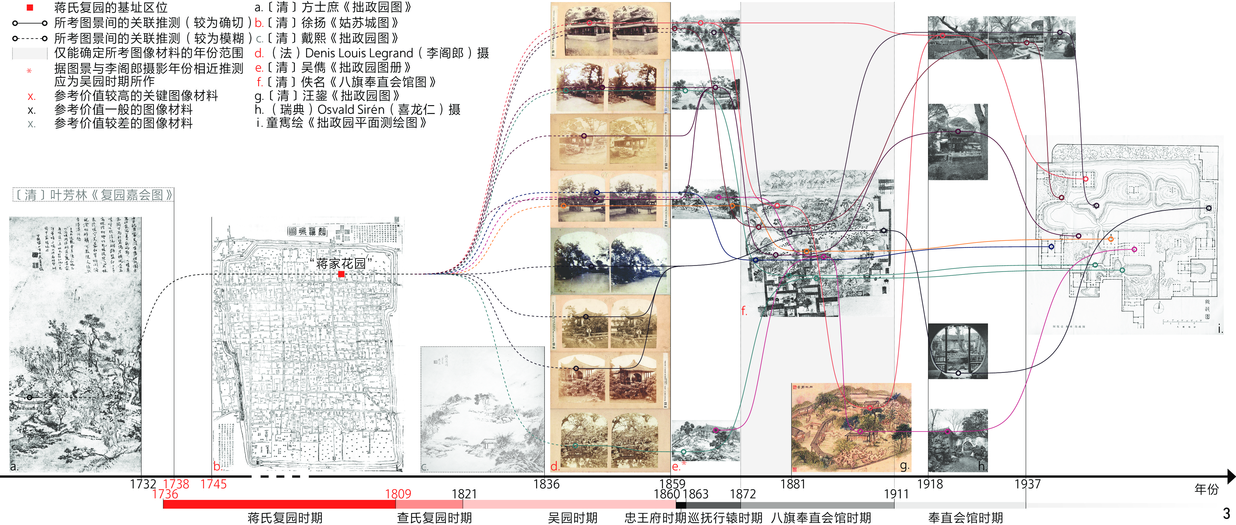 [Methods] This research employs targeted searches within the Suzhou Library’s Ancient Book Database to augment the existing corpus of literature pertaining to Jiang’s Fu Garden. Concurrently, a typological approach is employed to classify and illustrate the elements of “j ǐ ng” (scenery), the experience of “jìng” (realm), and the temporal distribution of the written content present in the aforementioned literature. This is done with the objective of elucidating the clues and basic characteristics of the Fu Garden’s scenery-realm subsequent to its restoration. Subsequently, image materials either directly and indirectly related to the garden in question are collected and organized. By identifying and correlating the content of the images, the potential and limitations of schematic layout recovery of the Fu Garden are elucidated, and the distinctive significance of a core scenic area named Yuanxiang Hall within the garden for understanding the value orientation of the Fu Garden’s restoration is highlighted, as well as the feasible conditions for its research. Based on the above macroscopic understanding of textual and image materials, a further step is to conduct a close reading and analysis of key historical materials in order to answer the key questions.