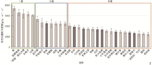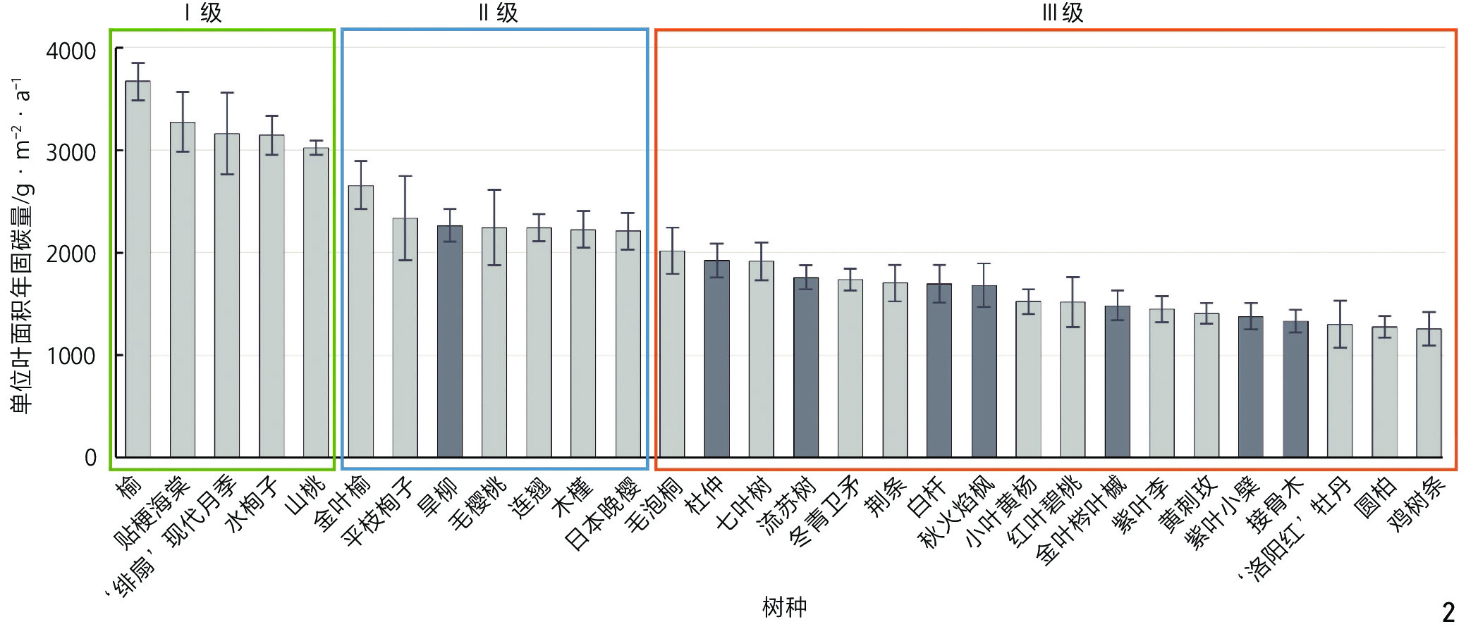 图1 不同生活型供试树种单位叶面积年固碳量、单位土地面积年固碳量、单株年固碳量比较Fig. 1 Comparison of annual carbon sequestration per unit leaf, per unit land area, and per plant of the tested tree species with different life forms |