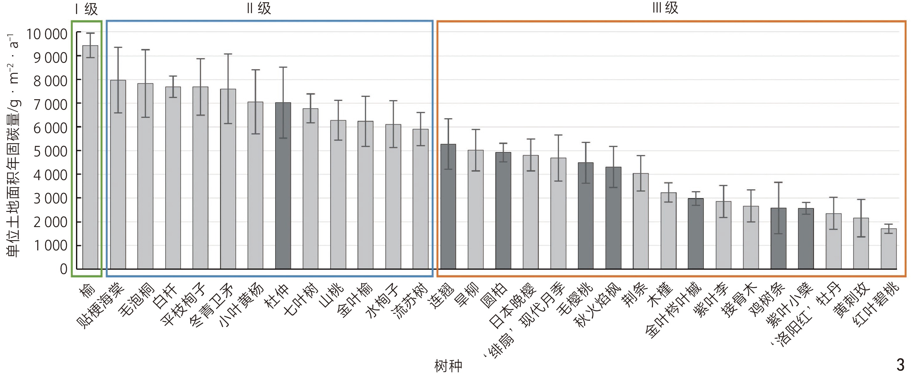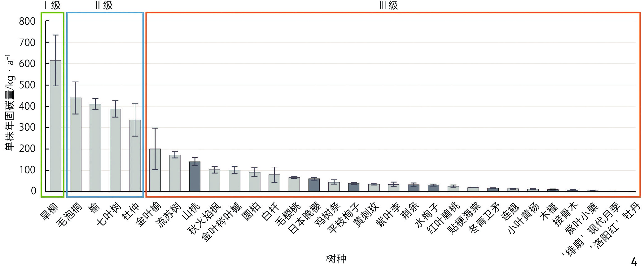 [Results] Among the tested tree species, the daily average photosynthetic rates of evergreen and deciduous tree species in different seasons follow the same order: Summer > spring > autumn > winter. According to the indicators of annual carbon sequestration per leaf area, annual carbon sequestration per land area and annual carbon sequestration per plant, the tested tree species can be divided into levels I, Ⅱ and Ⅲ (from high to low), respectively. The carbon sequestration capacity of Ulmus pumila is outstanding, which belongs to level Ⅱ and above in all the three indicators. The comprehensive carbon sequestration capacity of the tested tree species is evaluated based on annual carbon sequestration per unit land area and per plant, and the performance of Salix matsudana (among all the tested arbors) and Prunus tomentosa (among all the shrubs) is the best. Among all the tested tree species, the annual carbon sequestration per plant of arbors is significantly higher than that of shrubs, but there is no significant difference between the two in terms of both the annual carbon sequestration per unit land area and the annual carbon sequestration per unit leaf area. The reason why there is no significant difference in the annual carbon sequestration per unit land area between arbors and shrubs may be related to the application forms.