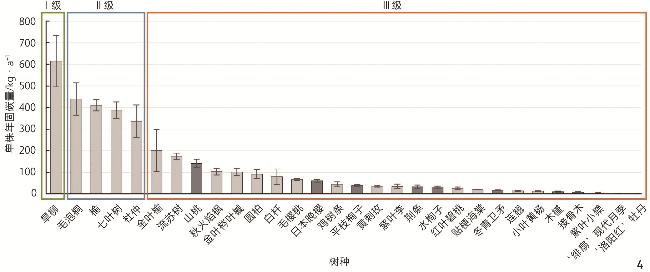 【目的】在“双碳”目标下,定量研究园林植物的光合固碳机理,评价、筛选高固碳能力的园林绿化树种,为城市绿地中植物材料的选择与配置提供科学的理论依据,助力低碳园林建设。【方法】以北京城市绿地30种常用园林绿化树种为研究对象,实地监测树种的光合生理指标,计算不同树种在不同季节的日均光合速率。采用同化量法核算供试树种单位叶面积年固碳量、单位土地面积年固碳量和单株年固碳量。根据上述3项指标数据,通过聚类分析对树种的固碳能力进行分级。【结果】在供试树种中,常绿和落叶树种在不同季节的日均光合速率均值变化规律均表现为夏季>春季>秋季>冬季。对于同一生活型的树种,不同树种的日均光合速率均存在差异。根据单位叶面积年固碳量、单位土地面积年固碳量和单株年固碳量,可将供试树种年固碳量由高到低划分为Ⅰ、Ⅱ、Ⅲ 3个等级。其中,榆(Ulmus pumila)的3项指标均为Ⅱ级及以上。综合单位土地面积年固碳量和单株年固碳量对供试树种的综合碳汇效应进行评价,乔木中旱柳(Salix matsudana)、榆、毛泡桐(Paulownia tomentosa)、杜仲(Eucommia ulmoides)、七叶树(Aesculus chinensis),灌木中毛樱桃(Prunus tomentosa)、荆条(Vitex negundo var. heterophylla)、鸡树条(Viburnum opulus subsp. calvescens)和黄刺玫(Rosa xanthina)的综合碳汇效应较强。乔木类树种单株年固碳量显著高于灌木类树种,但在单位土地面积年固碳量、单位叶面积年固碳量方面两者无显著差异,这可能与灌木类树种的应用方式有关。【结论】基于对北京市30种常用园林绿化树种固碳能力的核算、比较,筛选出综合碳汇效应较强的树种,可为未来北京市低碳园林建设的树种选择与景观营建提供科学参考。