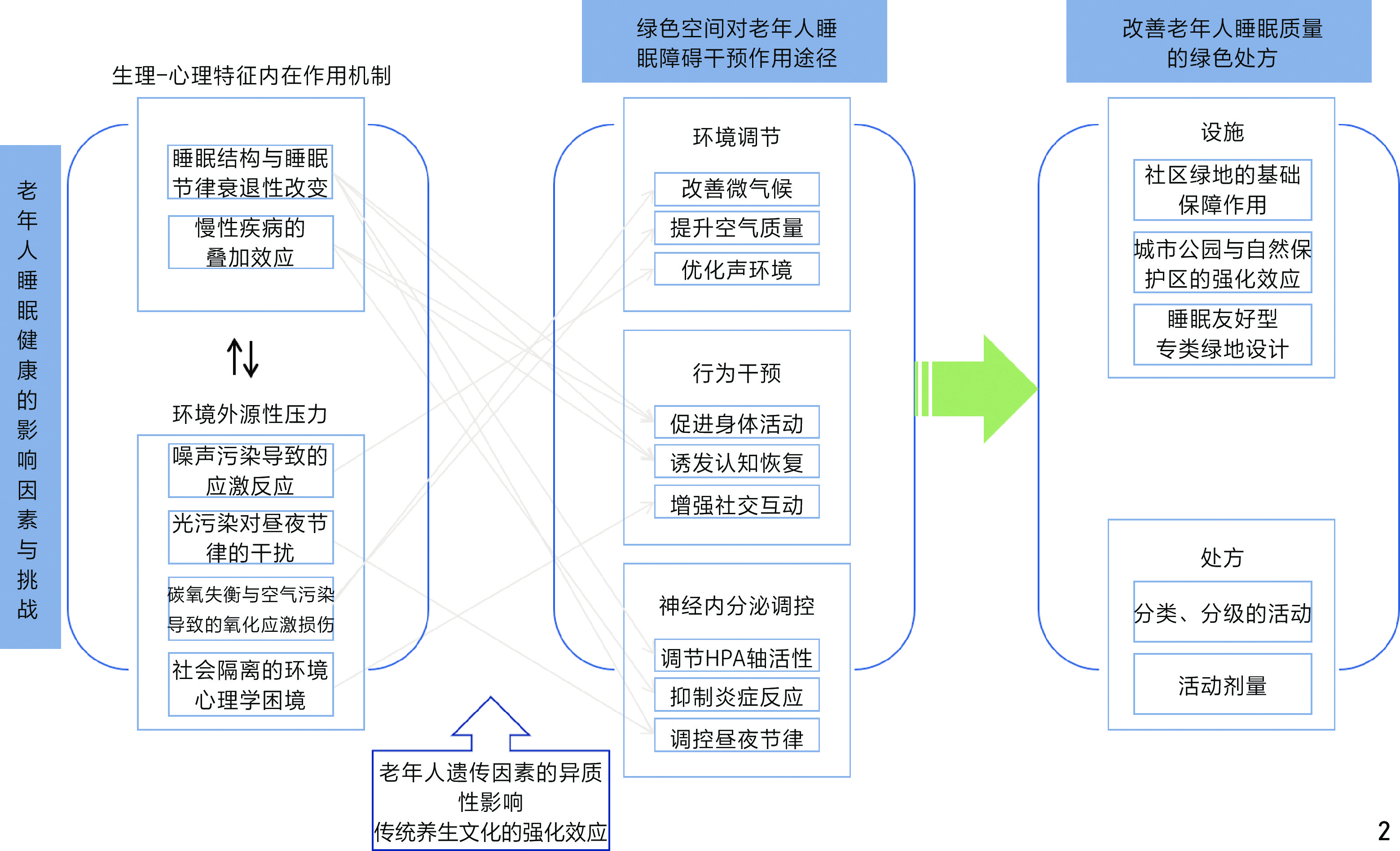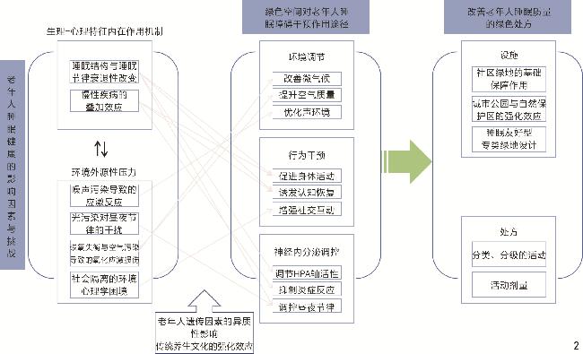 老年睡眠障碍受生理-心理特征内在作用机制与环境外源性压力的双重影响,而城市绿色空间通过环境调节、行为促进、社交支持及压力缓解等多维路径,可辅助调节昼夜节律、延长深度睡眠时长并降低睡眠片段化程度。同时,健康效益存在显著个体差异并受传统养生文化的影响。