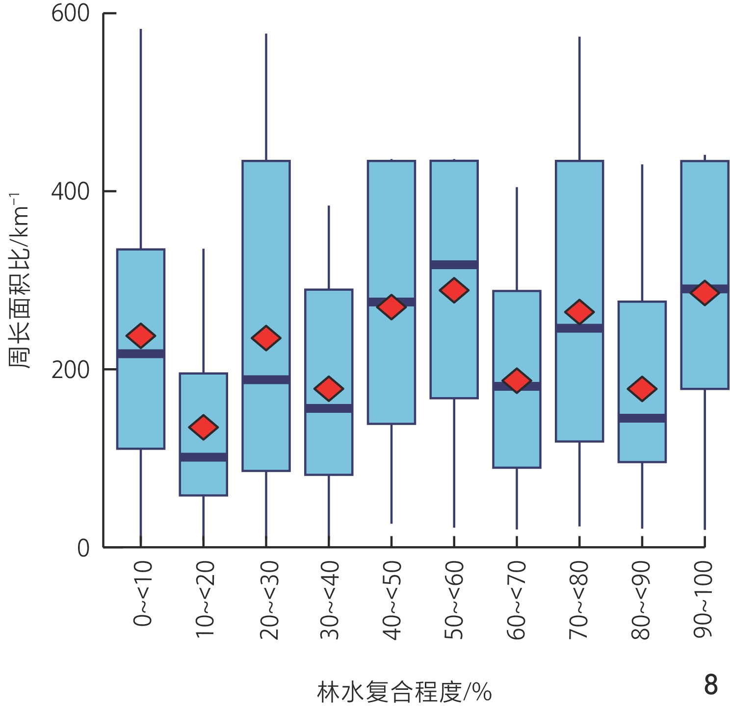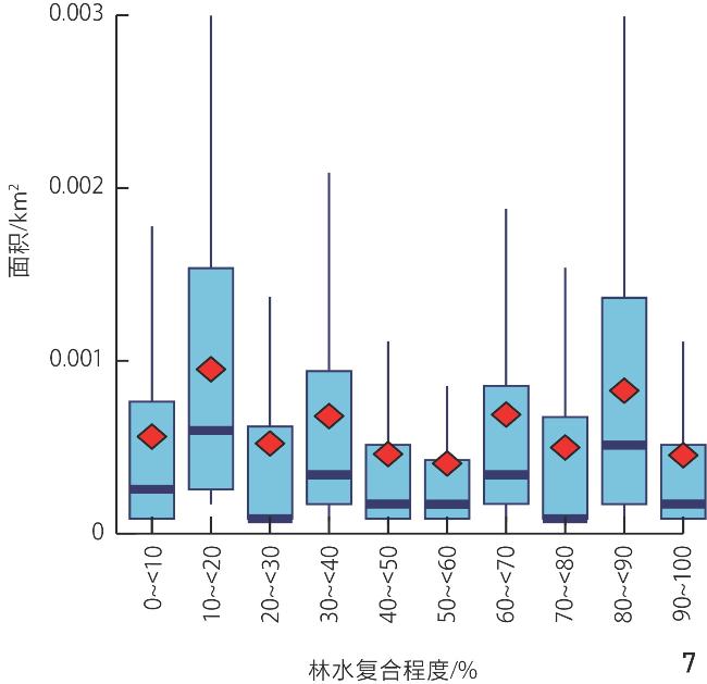 图7 不同林水复合程度水体的面积分布Fig. 7 Distribution of water body areas across different forest – water composite levels |