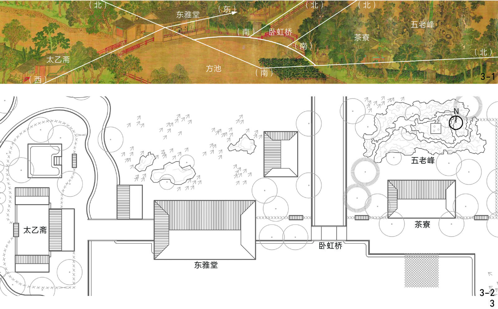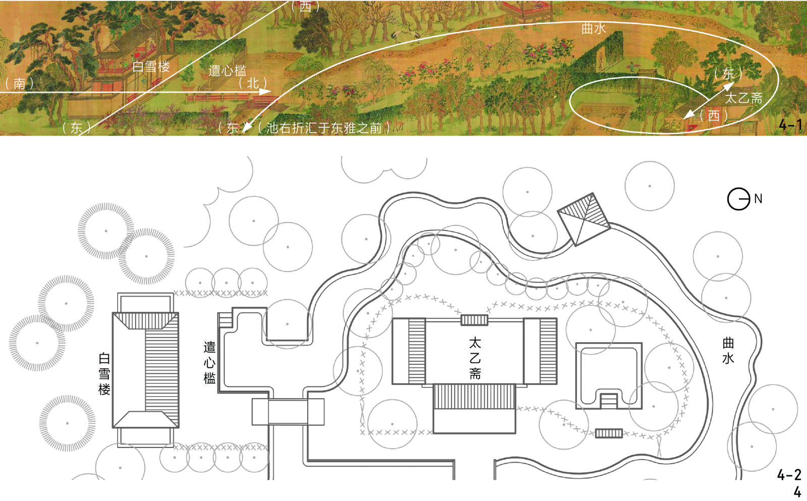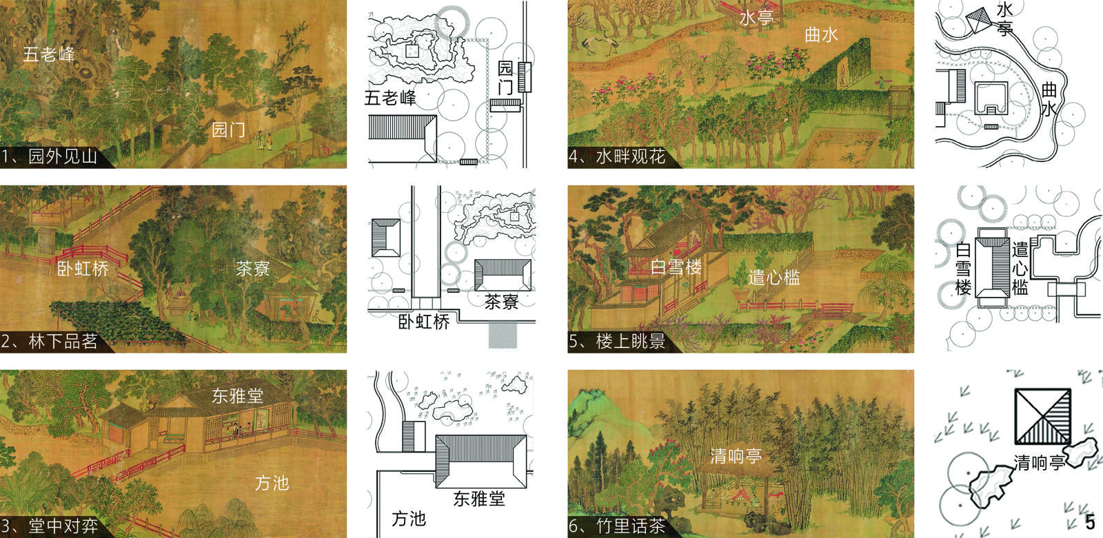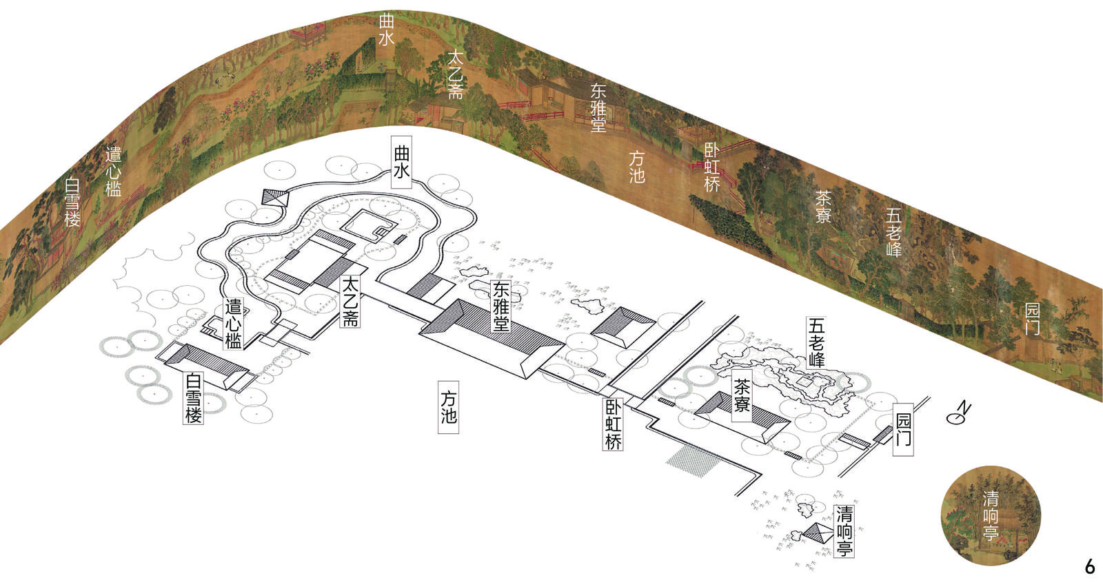 | 白雪楼、遣心槛 | 循池而右,楼名“白雪”,水槛名“遣心”……池右折汇于东雅之前 | ③ | 太乙斋附近的曲水尽端有白雪楼和遣心槛,曲水最终汇入东雅堂南侧方池 |