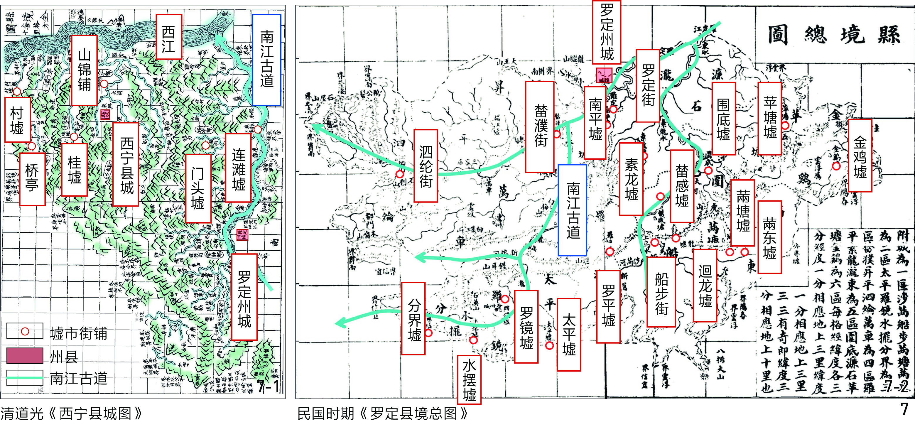 | 河谷平原 | 地势平坦,用地宽阔平缓 | 南江及其支流两侧冲积而成的平原上,傍水而生 | 规模较大,建筑布局规整、紧凑对外,通常有码头 |