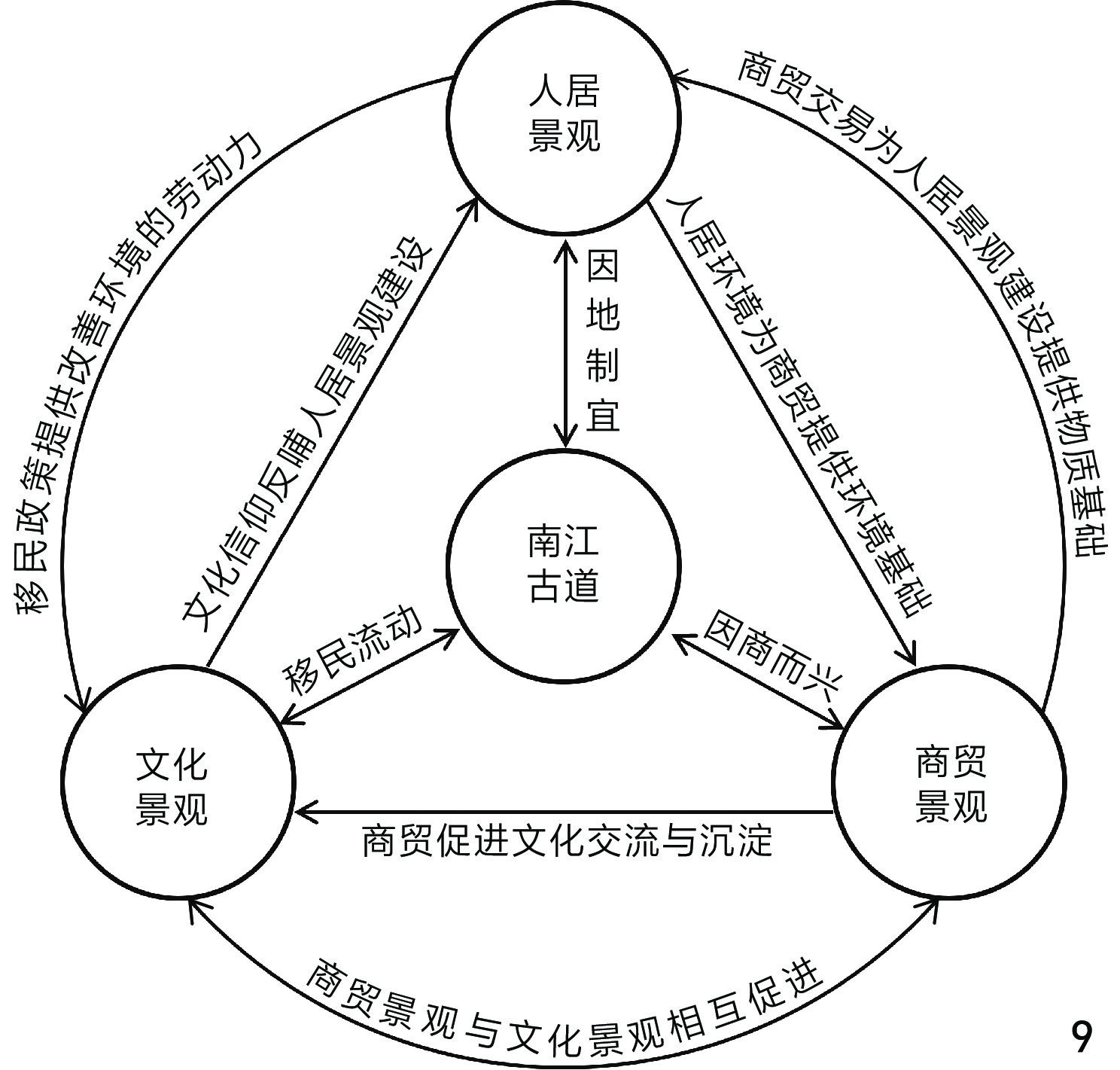【目的】 南江古道是南粤古驿道中唯一的古水路,沿线聚落形成独特的多元景观。从文化线路宏观视角探索聚落景观特征及影响因素,突破“就村论村”的点状研究局限,有助于挖掘聚落多维价值,为南江古道沿线地区的文化传承与可持续发展提供支撑。【方法】 基于文化地理学“人-地-产”理论框架,结合实地调研踏勘和GIS空间分析,运用类型学分析方法,从人居、商贸、文化3个功能维度凝练65处聚落的景观特征。【结果】 在“募民占籍”政策驱动、古道商贸往来、多元文化融合的影响下,南江古道沿线聚落景观呈现3个方面特征。1)人居景观呈现出“层次丰富,山水相拥”“因形就势,理风顺水”“渠网纵横,堤坝环绕”的特征;2)商贸功能与聚落商贸景观形成具有互促关系,形成“水陆通济,津渡交织”“临水营墟,因街成市”的商贸景观;3)移民文化相互交流,形成了“居祠分立,风格杂糅”“泛神崇拜,借水筑景”的文化景观。【结论】 聚落景观重构中,应秉持文化线路保护的整体性、动态性与可持续性原则,构建南江古道聚落保护的整体空间管控体系,打造融生态、文化、产业于一体的文化线路游径,促进聚落的振兴发展。