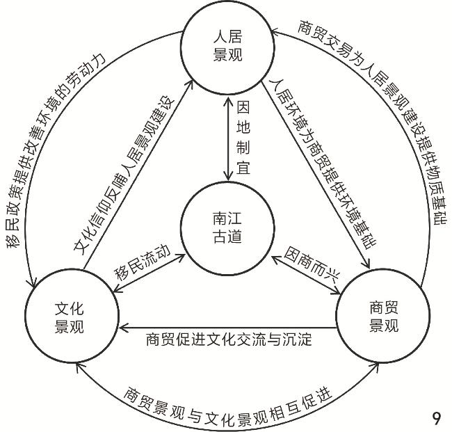 [Conclusion] The settlements along the Nanjiang Ancient Waterway, are the spatial carriers of human settlement landscape, commerce, culture and other functions. The population base provided by the immigration policy is the starting point of settlement development. As a key factor, immigration policy provides the necessary population base for the formation of settlements along the ancient waterway, and is the starting point of settlement development. The distribution and rise of immigrant settlements along the Nanjiang Ancient Waterway, benefited from the efficient water transportation system constructed by the ancient waterway network, and the flourishing commercial development of settlements along the ancient Waterway. The mutual fostering between population mobility and trade greatly promotes the exchange and integration of immigrant culture, giving birth to Nanjiang regional cultural landscape. Revealing the landscape characteristics of settlements along the cultural routes and the influencing factors thereof from the perspective of integrity and dynamics can provide a basis for the overall protection of settlements along the Nanjiang Ancient Waterway. Under the background of rapid urbanization, the protection of settlement landscape along the Nanjiang Ancient Waterway has encountered severe challenges such as the decline of traditional features and the imbalance of development. In the reconstruction of settlement landscape, we should adhere to the principles of integrity, dynamics and sustainability of cultural route protection, integrate natural and human landscape resources, and rationally activate and utilize settlement landscape. The researches advocates to well protect the Nanjiang Ancient Waterway through the chain of beads, the implementation of zoning – subsection – grading differentiation development, the establishment of the overall spatial control system for the protection of settlements along the Nanjiang Ancient Waterway, the construction of cultural routes for the integration of ecology, culture and industry, the creation of nostalgic settlement memory scene, and the promotion of the revitalization and development of settlements.