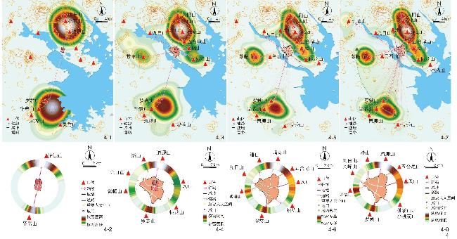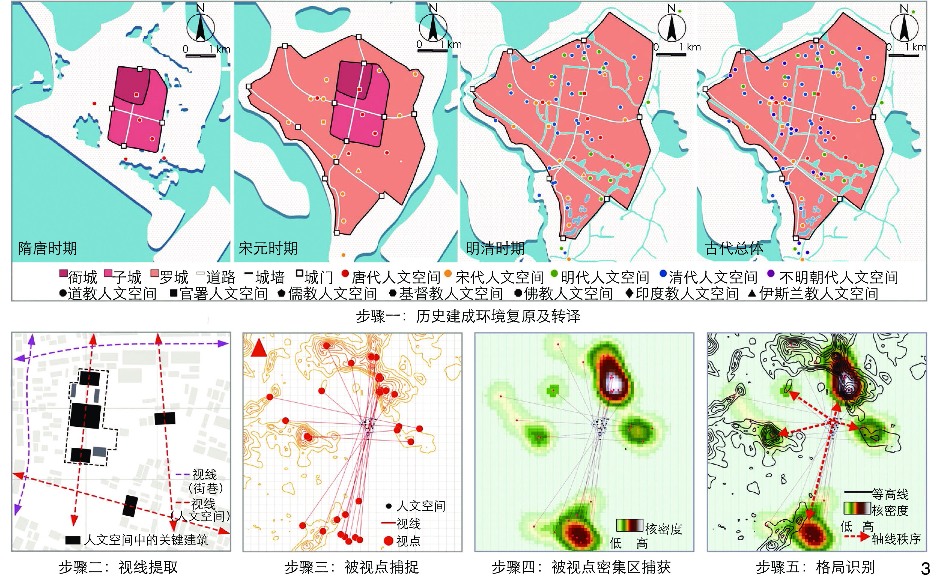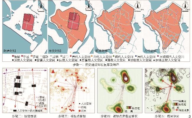 【Objective】As an important prerequisite for exploring the wisdom of traditional construction, the identification of pattern of landscape and humanity space is conducive to the proposal of pattern development strategy and the construction of identification technology, and can help solve the problem that a large number of urban spatial patterns need to be identified and protected.【Methods】Following the space construction principle of “establishing line-of-sight correlation between humanity space and landscape”, this research constructs an identification approach for spatial pattern that includes five steps: “restoration and translation of historical built environment”, “extraction of line of sight”, “capture of viewed points”, “capture of densely viewed areas” and “identification of spatial pattern”, in order to open up a new perspective for the identification, protection and development of urban spatial patterns. Specifically, the “extraction of line of sight” means using the create features tool of ArcGIS to extract the orientation of humanity spaces and streets to simulate the line of sight; the “capture of viewed points” means using the Intersection Snapping Tool of ArcGIS to capture the intersection of the light of sight and the maximum value of the contour line to simulate the viewed point; the “capture of densely viewed areas” means using the kernel density analysis tool of ArcGIS to analyze the kernel density of viewed points and obtain densely viewed areas; the “identification of spatial pattern” means determining the cultural order within the city and identifying the pattern of landscape and humanity space by comparing the consistency between the densely viewed areas and visible mountain peaks at a macro scale, and analyzing the correlation between the orientation of highly consistent streets, humanity spaces and mountain peaks at the urban scale.【Results】The research results show that in Sui and Tang dynasties, when the ritual order dominated urban construction, the pattern of landscape and humanity space in Quanzhou City was mainly distributed along the north-south direction, forming a north-south single axis connecting Qingyuan Mountain and Luochang Mountain, and laying a solid foundation for the long-term development of the spatial pattern of Quanzhou. During Song and Yuan dynasties featuring economic prosperity and development, Quanzhou, under the dual influence of foreign and local cultures, presented a trend of diversified and personalized urban construction to meet multiple needs such as economic, religious and cultural needs, forming a central divergent spatial pattern overlooking seven mountains. During Ming and Qing dynasties when urban construction was dominated by folk religion, relying on the street framework and driven by the “Pujing” (“mirror laying”) systempattern, Quanzhou actively built humanity space with a specific orientation to enhance the line-of-sight correlation, and created a spatial pattern emphasizing two horizontal axes and one vertical axis and clarifying the two mountains of Chao Mountain and An Mountain. In summary, Quanzhou continued and strengthened the “牛” (“Niu”)-shaped pattern led by the four axes through the coordinated construction of humanity spaces based on line-of-sight correlation. This evolutionary process exhibits the characteristics of enriched belief, personalized orientation, and scientific concept. The analysis of the aforesaid spatial pattern reveals that in terms of spatial order, Quanzhou seeks the ingenuity of nature and constructs humanity spaces with artistic conception, thus forming a spacial pattern featuring inheritance and leadership, with the “Double Ten” axis determining the spatial pattern of the eastern urban area, while the axis facing Zimao Mountain determining the spatial pattern of the western urban area. In terms of landscape construction, through the development and supplementation of humanity spaces, Quanzhou establishes a landscape system featuring city − mountain integration with a strong sense of charm; in terms of cultural connotation, mountains are related to urban culture and life, thus consolidating urban cohesion and centrality.【Conclusion】Upon review and analysis, this research concludes that the pattern of landscape and humanity space in ancient Quanzhou City contains three types of construction wisdom: Construction essence of extension and sustainability of spatial order; design techniques for the hierarchy and accessibility of landscape organization; application wisdom of interaction and mutual promotion between nature and culture. Future research may expand the case studies of landscape cities in terms of research object, carry out intelligent innovation and improvement in research method, and guide the formulation of spatial pattern restoration and development strategy in practice, thus achieving the goal of comprehensive understanding and protection of the historical pattern of landscape and humanity space.