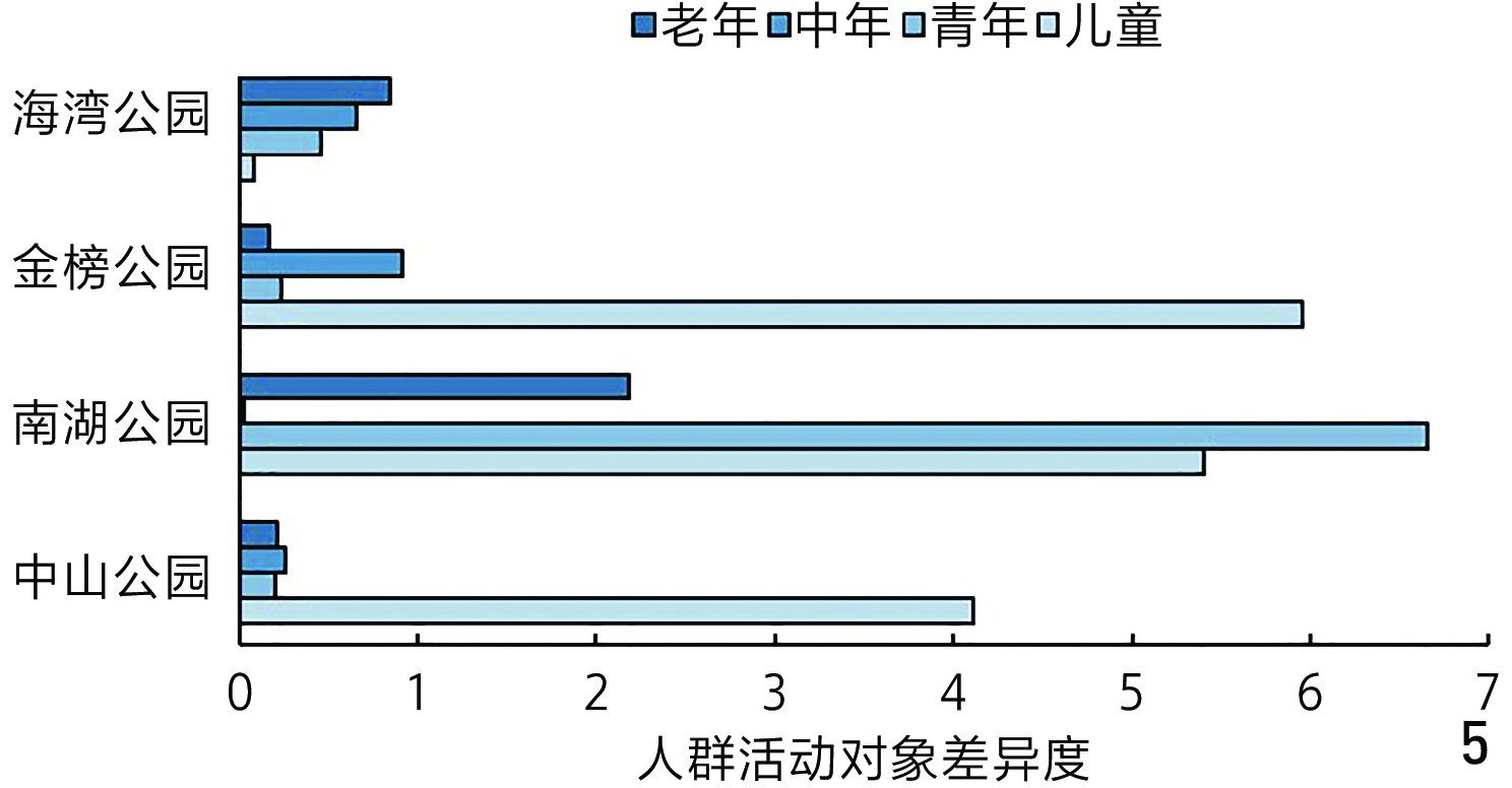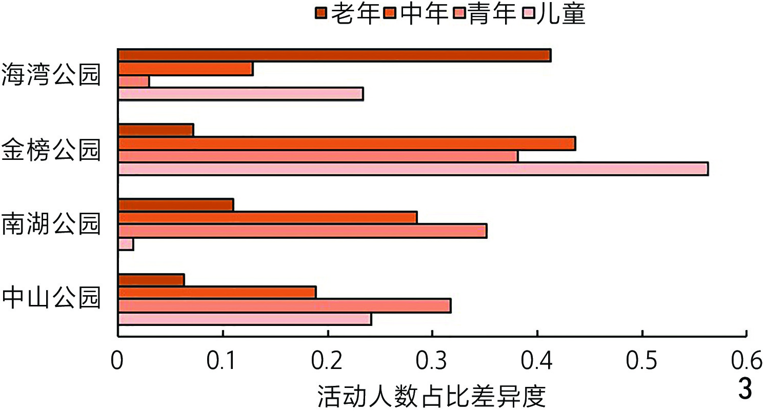 表2 各公园的活动人群年龄结构友好度评价结果Table 2 Evaluation results of age structure friendliness of the activity crowd in each park |