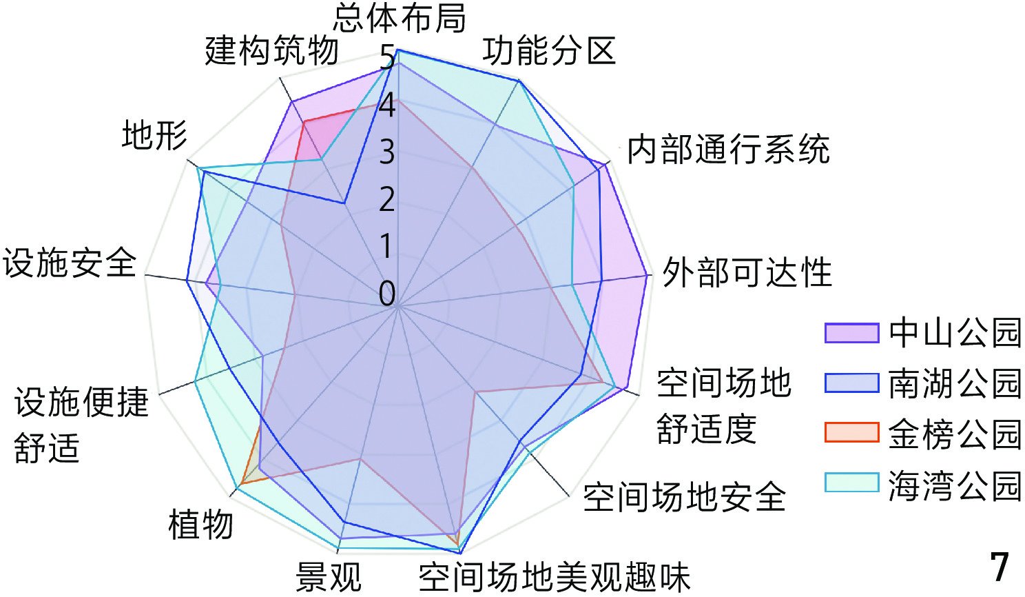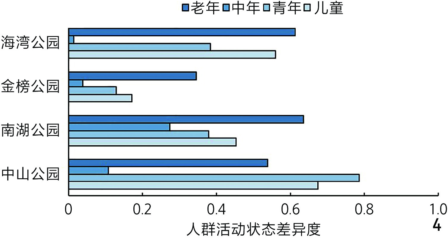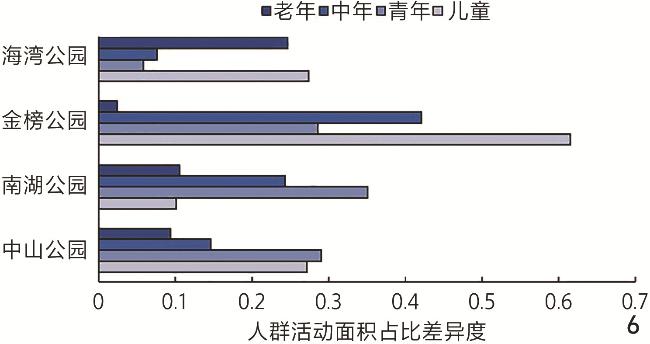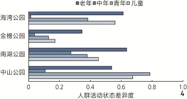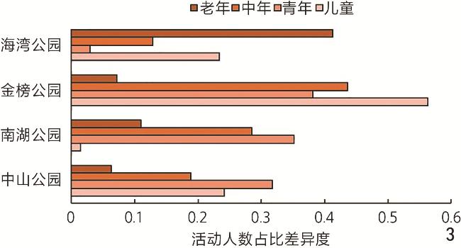 不同类型公园的全龄友好度不同:海湾公园全龄友好度最高但老年友好度不足;中山公园对老年、儿童群体友好,但中青年群体友好度欠佳;南湖公园活动比例失衡影响空间使用;金榜公园因地形复杂全龄友好度最低。不同公园对各年龄层群体的友好度也存在差异:对老年群体友好度最高,对儿童、中年、青年群体的友好度依次降低。