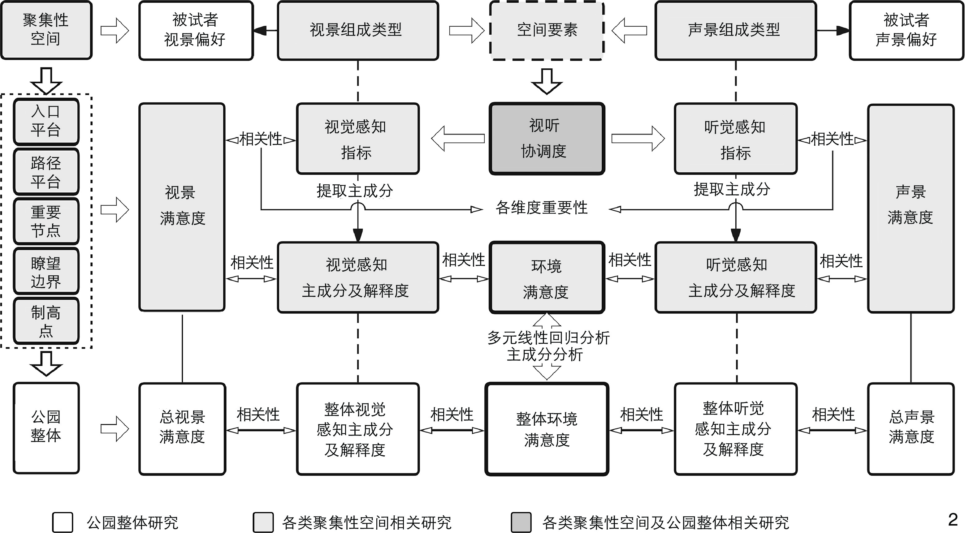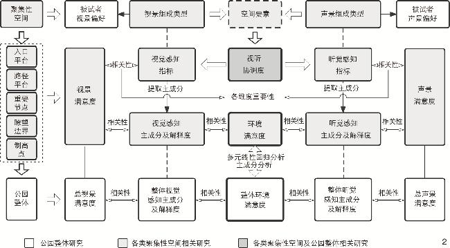 以重庆市渝中区枇杷山公园和鹅岭公园的5类聚集性空间作为研究对象,通过视声景调研与空间实测,选取12个视觉感知指标与10个听觉感知指标,形成问卷评价量表,采用主成分分析、Spearman相关性分析和多元线性回归分析,探索青年群体的视听感知协调度,以及各视听感知维度对视景、声景满意度,各类聚集性空间环境满意度与公园整体环境满意度的影响。