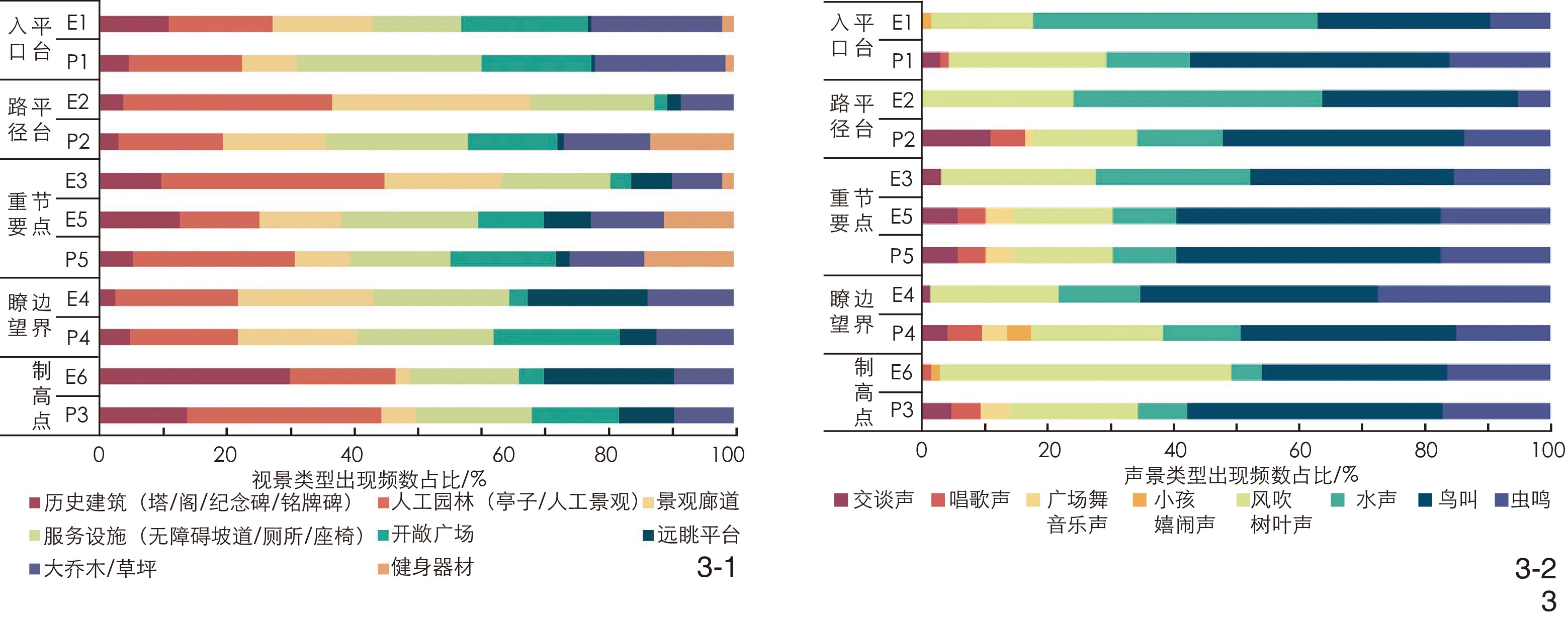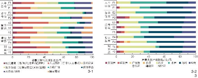 图3 5类聚集性空间中被试者的视景类型偏好(3-1)与声景类型偏好(3-2)Fig. 3 Types of visual landscape (3-1) and acoustic landscape (3-2) preferred by the subjects in five types of gathering spaces |