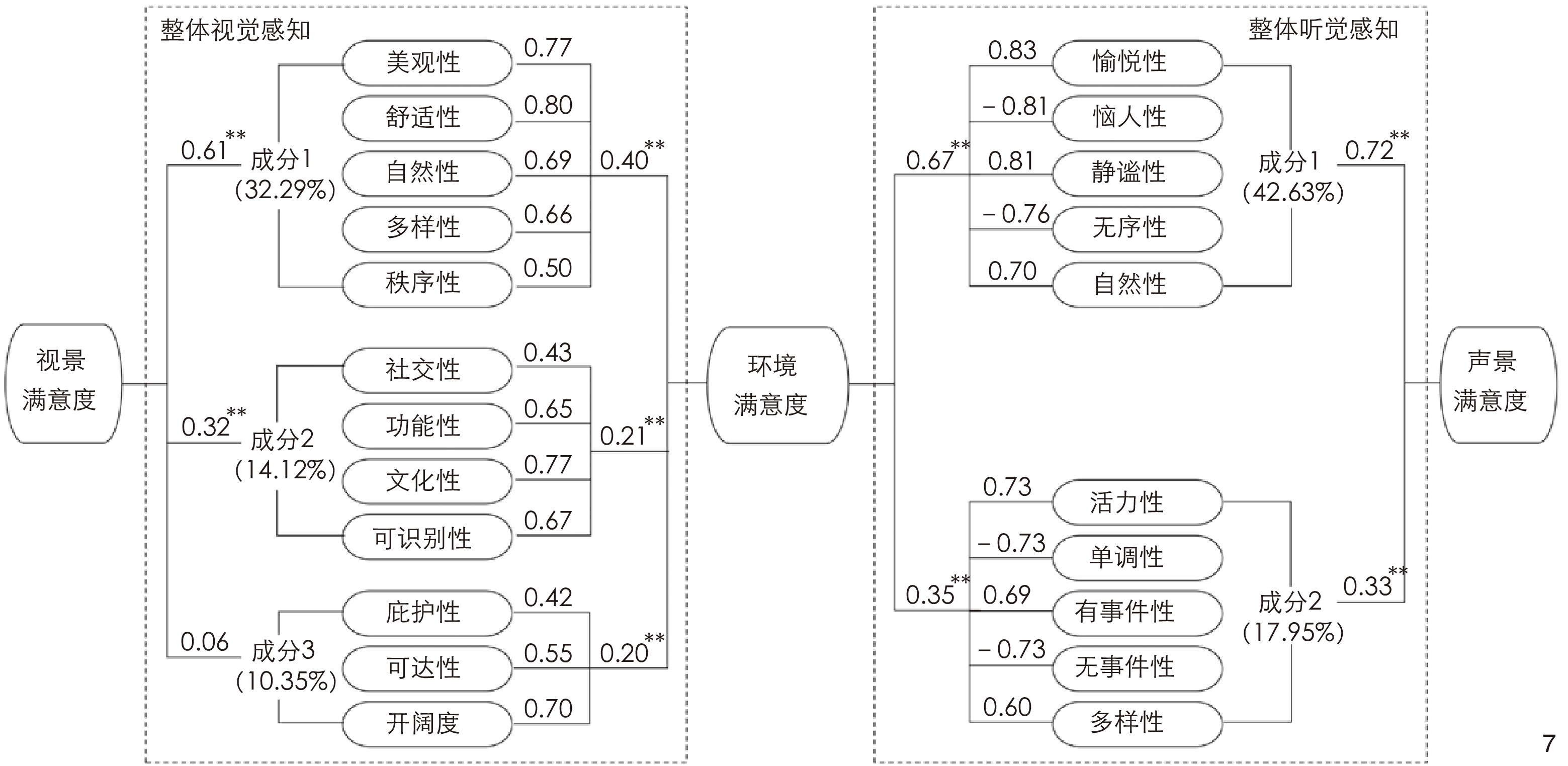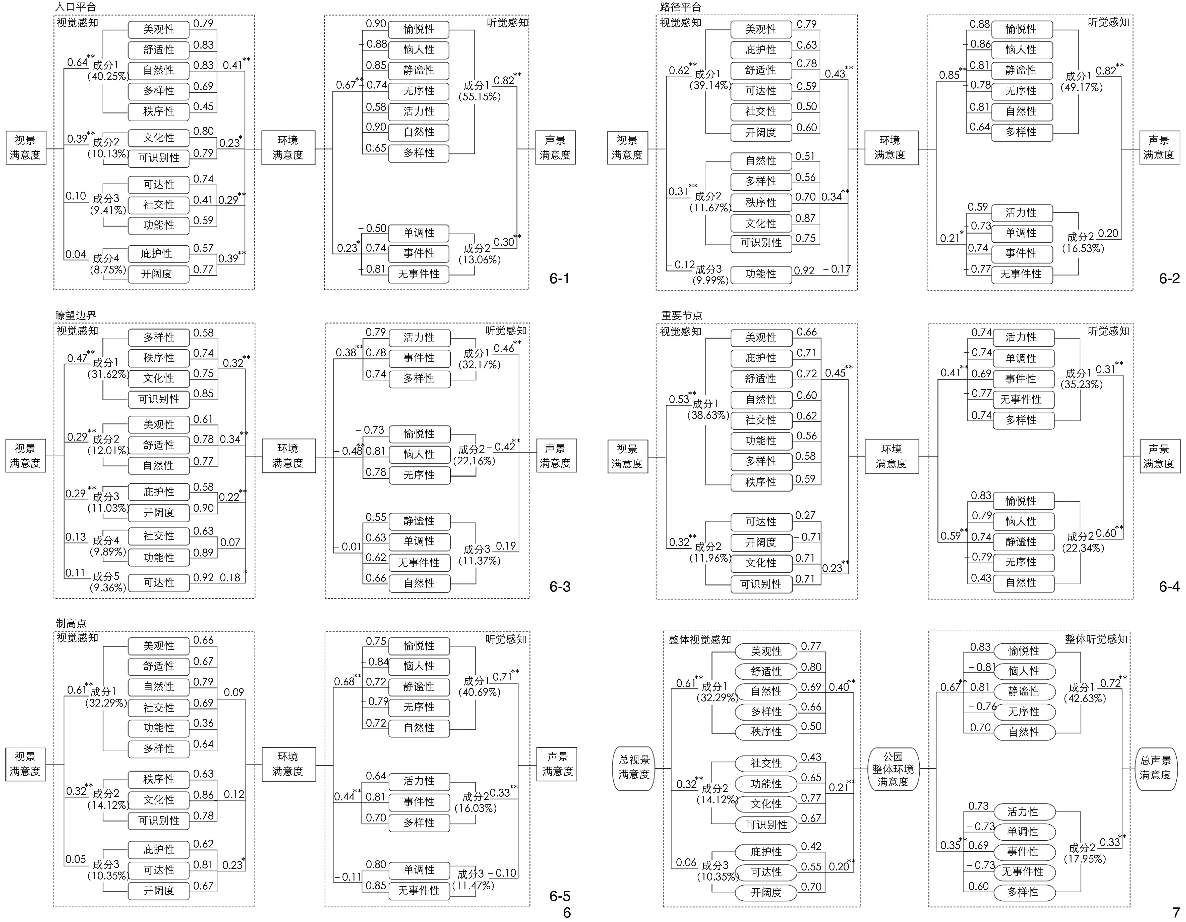 | 视觉感知与视景满意度 | 舒适性 | 0.88 | 0.72** | 1.46 | 0.69** | 1.67 | 0.65** | 1.50 | 0.39** | 1.85 | 0.67** | 1.47 | 1 | ||||