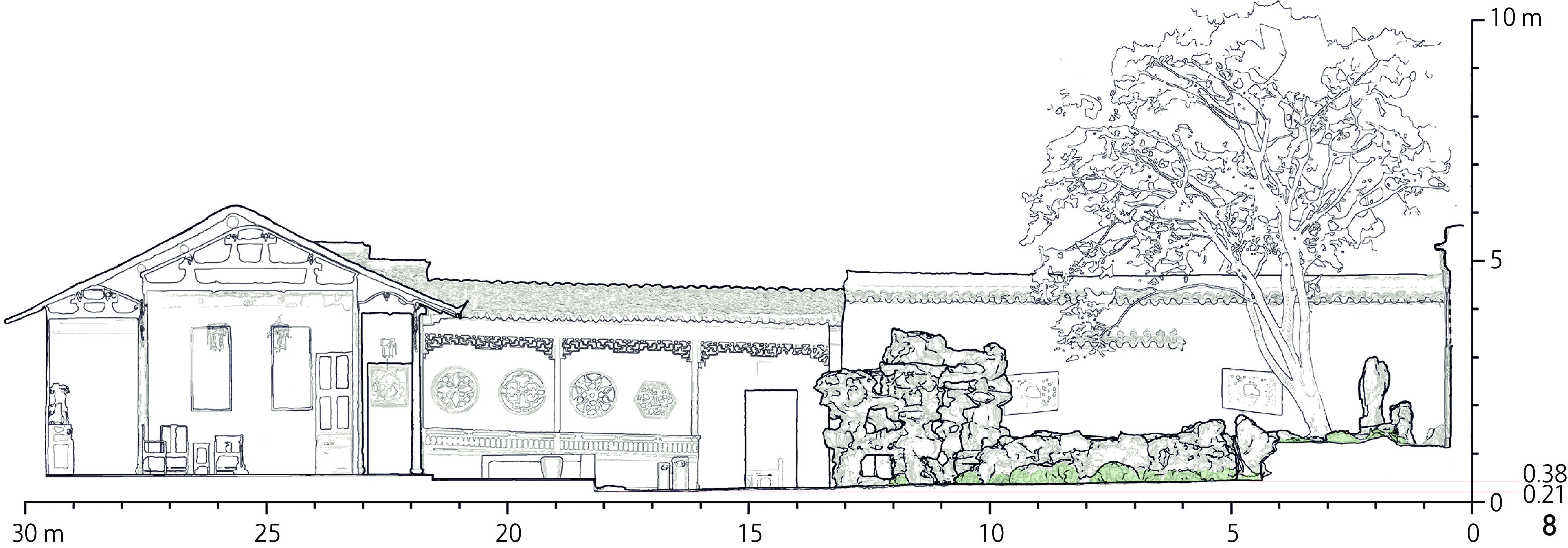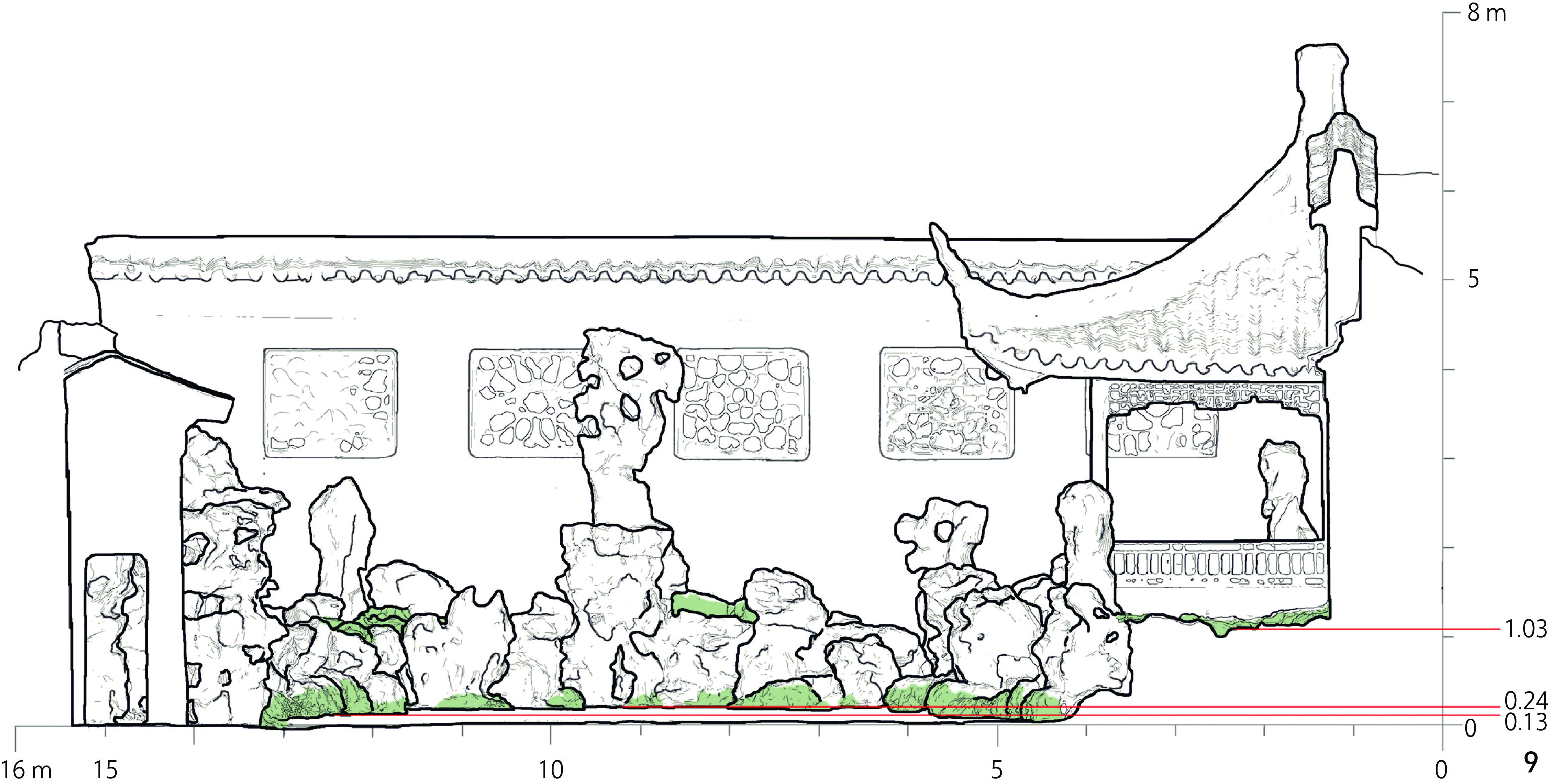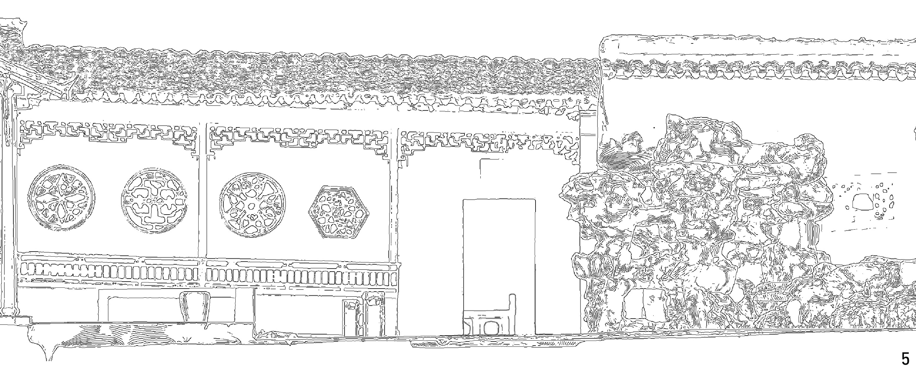 | 屋顶平面图、一层 平面图 | 屋顶(1 660)、院墙(687)、建筑墙体(718)、峰石(343)、花坛(82) | ≥80 | 台阶踏步(68)、叠石的石块(35)、地被(21) | [20,80) | 石块皱褶(19)、地被纹理(17)、盖瓦表面(14) | <20 | ||