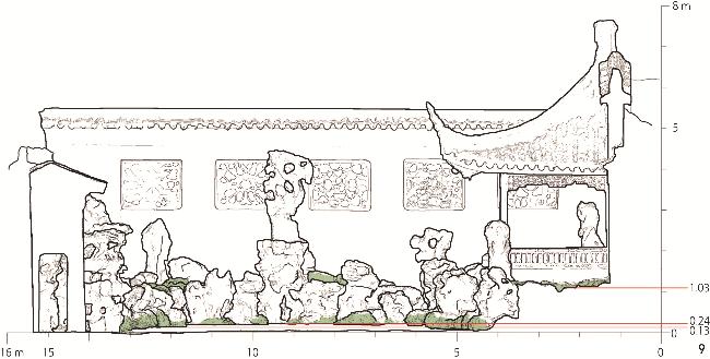 | 剖立面图 | 墙体(525)、台阶(154)、峰石(1 148)、山洞(357)、花坛(184) | ≥150 | 窗洞(42)、檐瓦(41)、假山内部石块(61) | [40,150) | 石块的表面纹理皱褶(38)、地被纹理(32) | <40 | ||