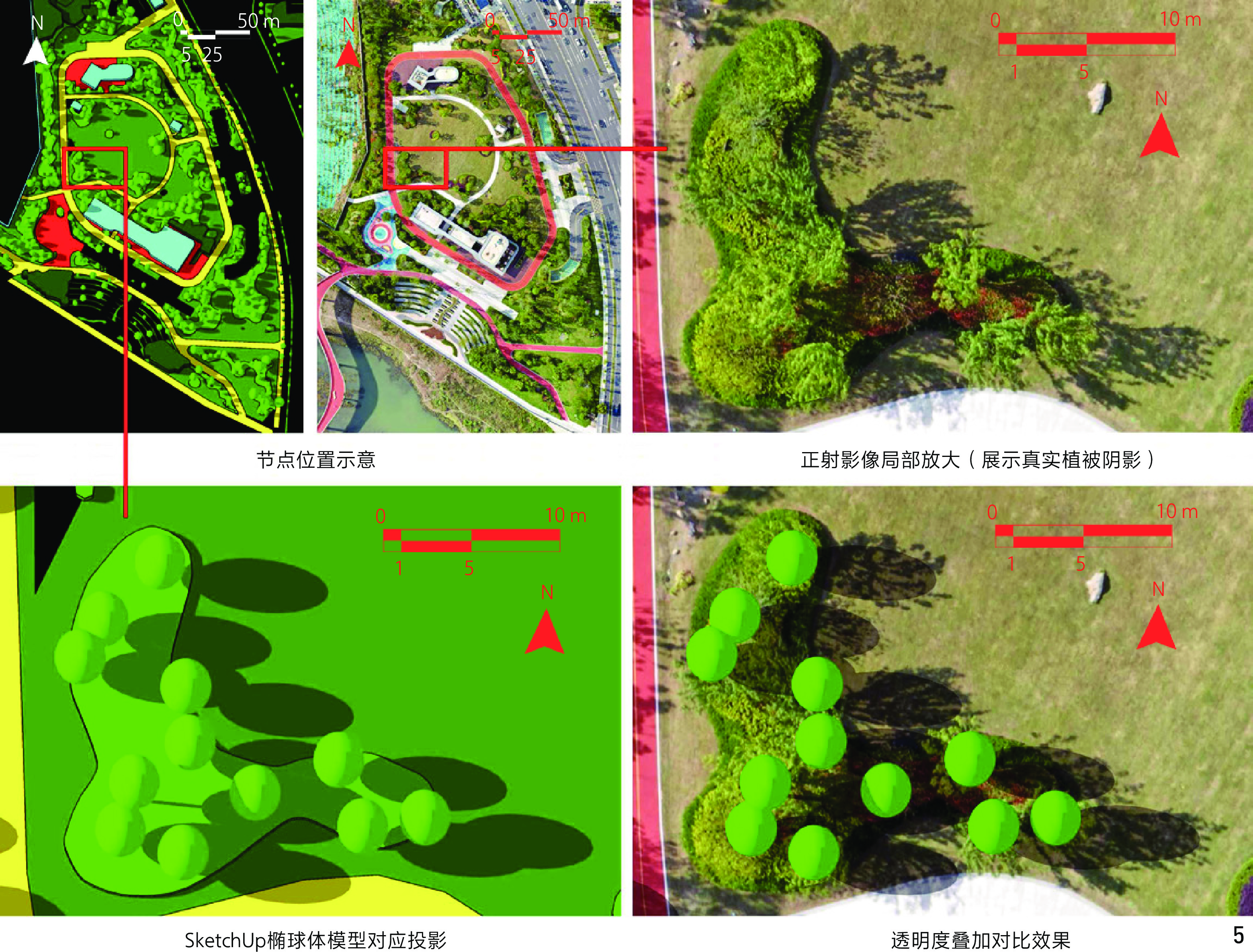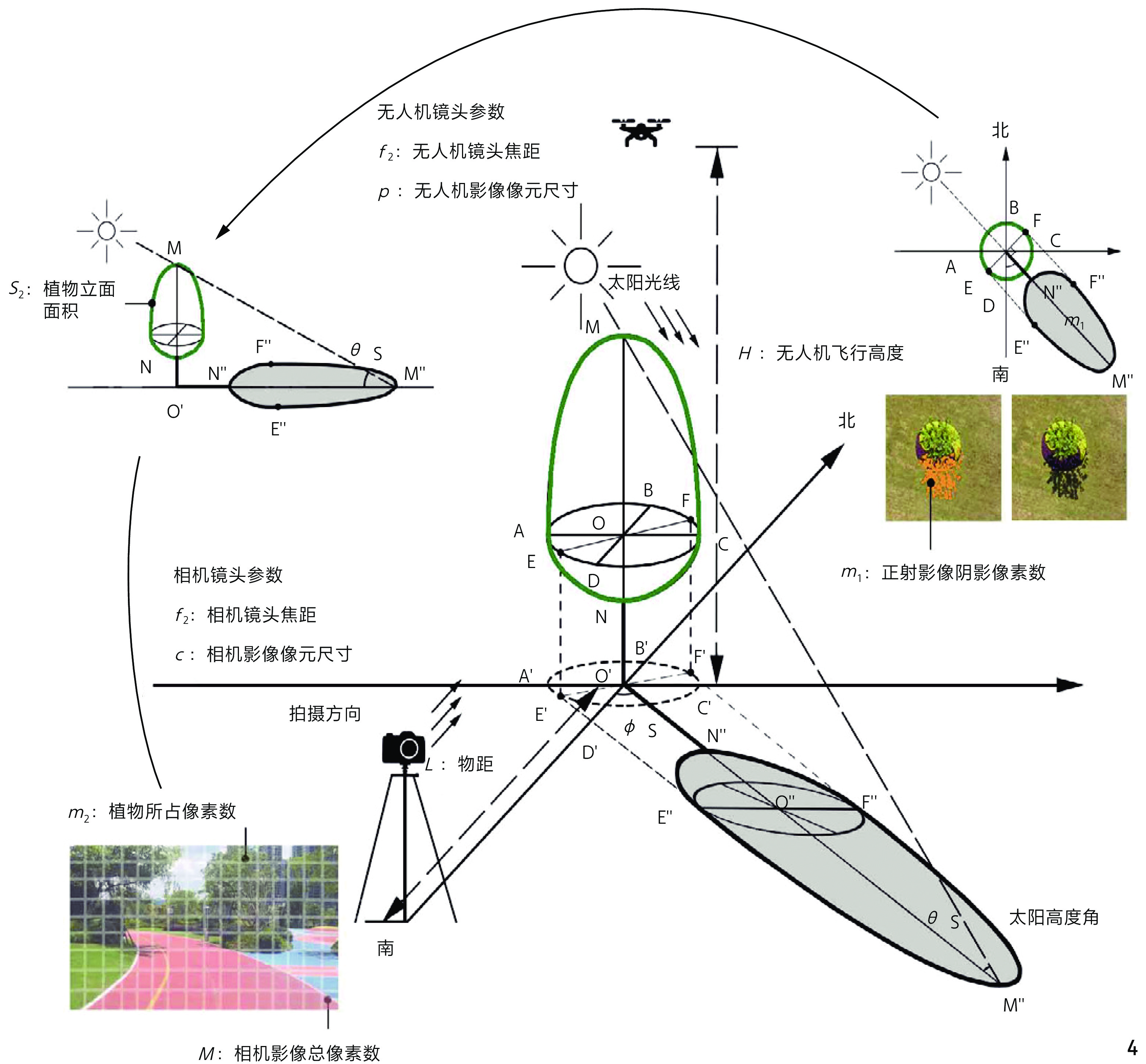 Two representative small-to-medium-scale, low-density green spaces—Ginkgo Square (YS) on a university campus and Jinxiu Park (JS) in Hangzhou Lin’an District—were strategically selected for validation, as their simplified vegetation structures minimized 3D occlusion complexities during this foundational study. Using stratified sampling reflecting pedestrian movement patterns, 112 observation points covered roads, recreational zones, and transitional areas. Based on projective geometry principles, a quantitative “shadow−facade−GVI” mapping model was developed: First, DJI Mavic 2 drones captured high-resolution orthophotos (100 m altitude, 10 mm focal length, 24 mm ground sample distance) during summer daylight hours, while 308 on-site GVI images were synchronously taken at 1.5 m eye height using standardized protocols (24 mm focal length, 16∶9 aspect ratio) to simulate human perspective. Pix4Dmapper software performed geometric corrections (WGS 84/UTM zone 50N), enabling manual extraction of vegetation shadow locations and pixel areas (m 1) from orthophotos. Vegetation facade area (S 2=S 1·tanθ S) and equivalent volumes (modeled as rotational ellipsoids) were derived using solar elevation angle (θ S), dynamically calculated from GPS coordinates, date, and local time. SketchUp then constructed simplified 3D scene models—representing trees as ellipsoid canopies (derived from crown shadows) combined with cylindrical trunks, extruding shrubs/structures from shadow footprints, and modeling dense woodlands as aggregated volumes. The theoretically derived formula I GV=(m 1×tanθ S/M) (f 1×p×H/f 2×c×L)2×100% quantified relationships between GVI and orthophoto-measured parameters. Python scripts automated GVI calculation by identifying green pixels, with pedestrian-route-weighted spatial integration generating overall site GVI. Model reliability was rigorously tested via Spearman’s rank correlation and linear regression analyses using 275 paired field-simulation samples.