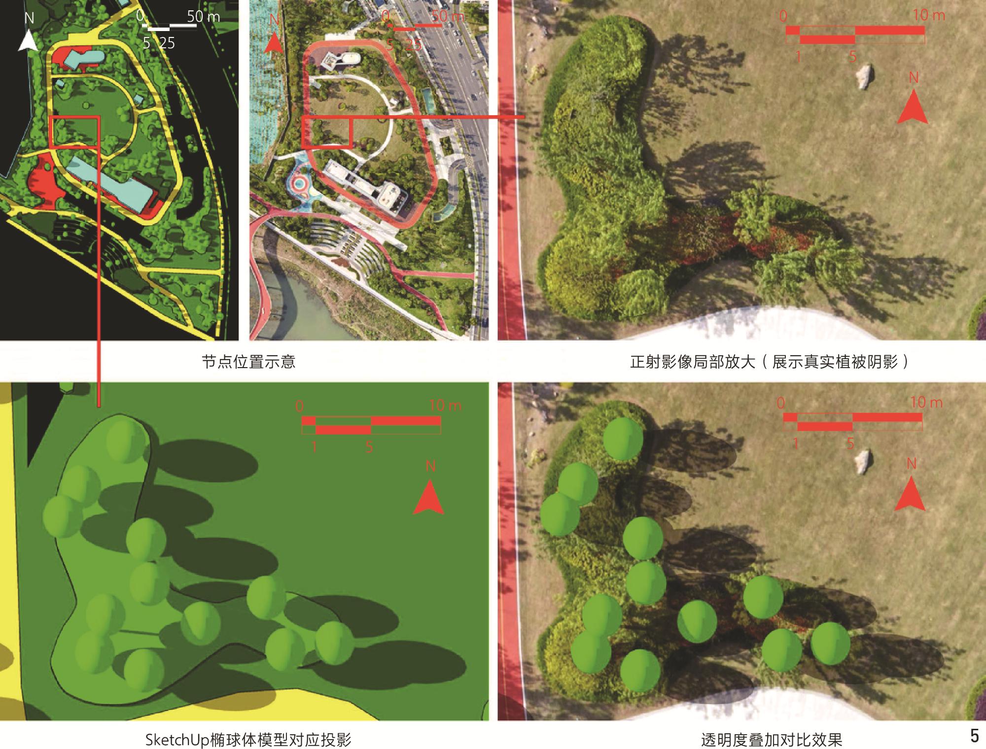 逻辑推导得出基于正射影像数据的绿视率计算式,从理论方面证明了方法的可行性,揭示了绿视率与正射影像中植物阴影的几何参数、太阳高度角、测点与周边绿化的空间距离等要素之间的定量映射关系。对275组实地与模拟绿视率数据的分析表明,两者呈现显著线性关系,模型验证了方法的可靠性。