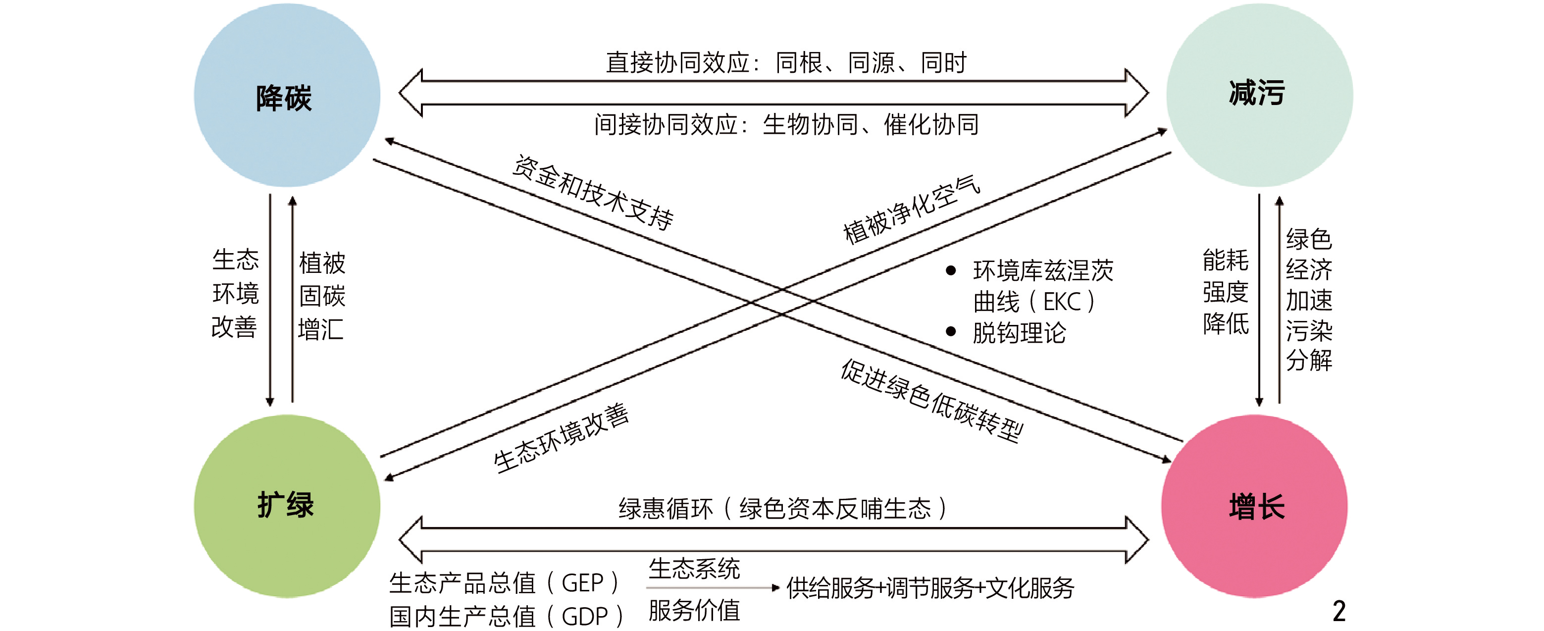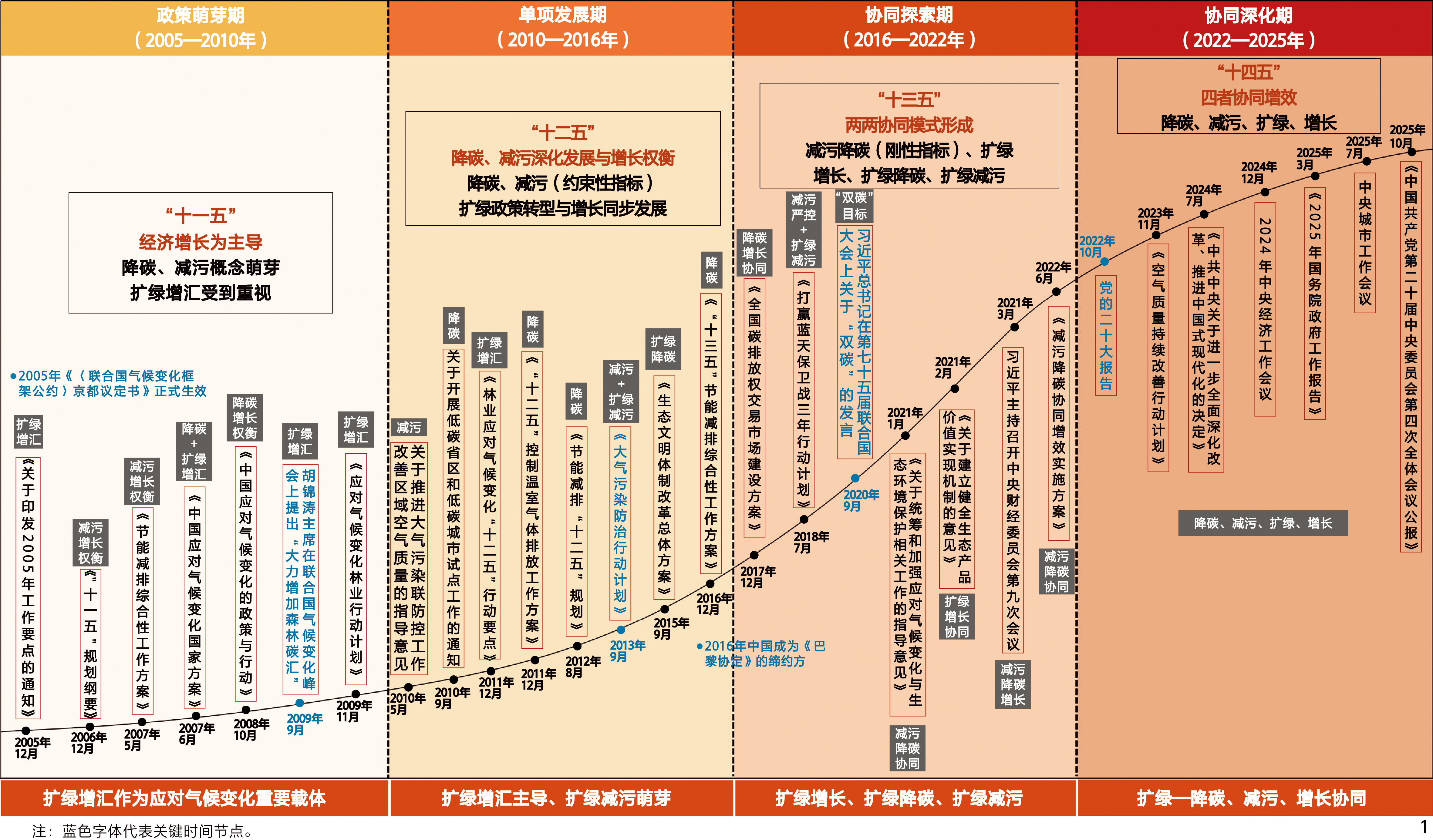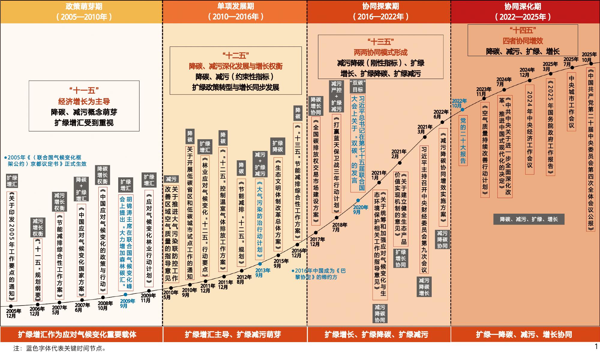 1、系统梳理2005—2025年“降碳、减污、扩绿、增长”国家政策演进及四者关联机制,揭示从单项治理到“四轮驱动”协同深化的阶段特征。