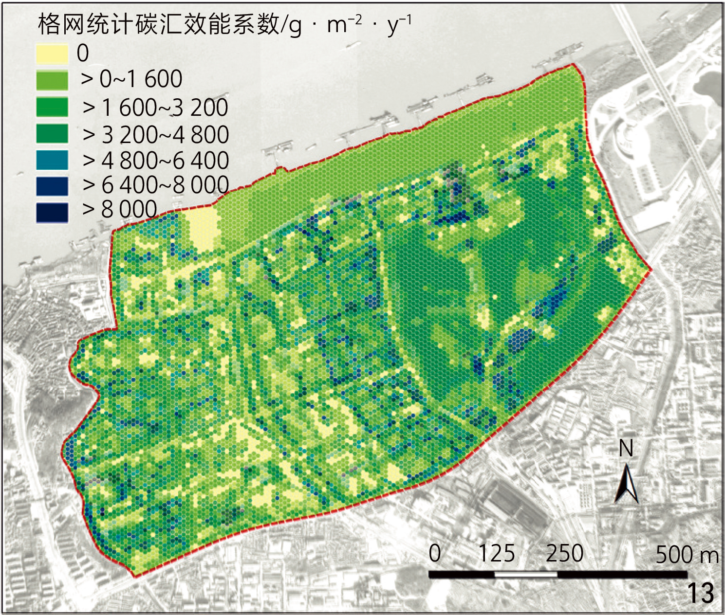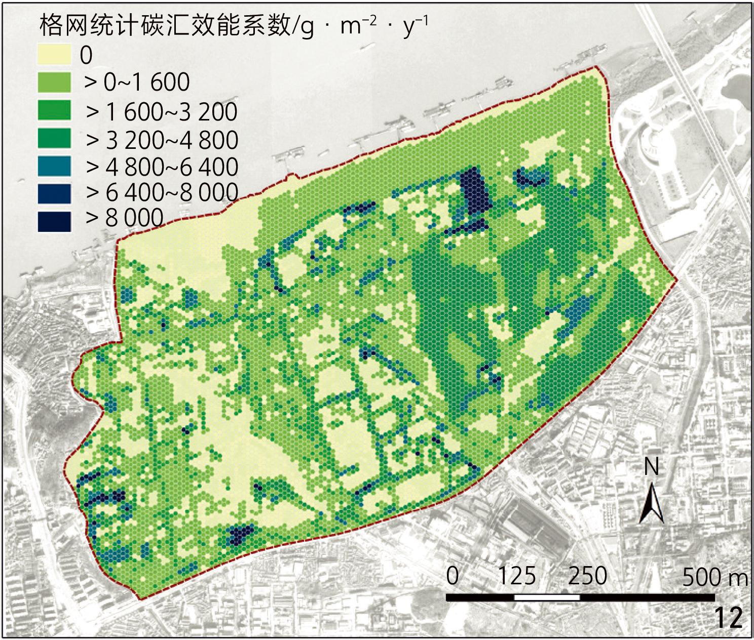 图13 更新方案碳汇效能系数空间量化格网Fig. 13 Grid-based spatial quantification of carbon sequestration efficiency coefficient under the redevelopment plan |