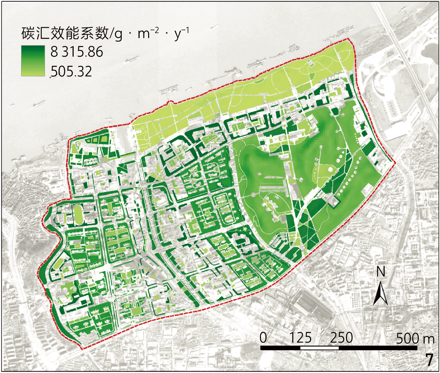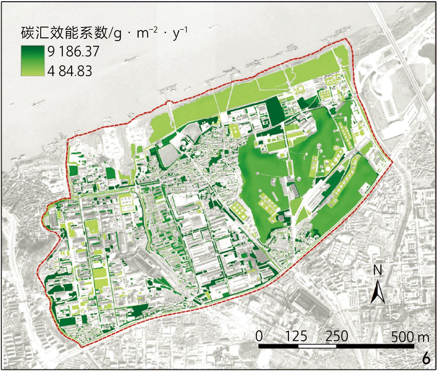 图7 更新方案碳汇效能空间量化Fig. 7 Spatial quantification of carbon sequestration efficiency under the redevelopment plan |