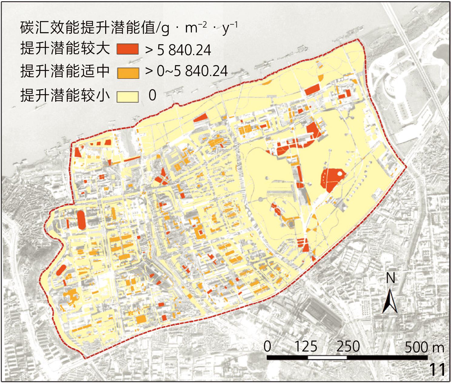 图11 更新方案碳汇效能提升潜力分级Fig. 11 Classification of carbon sequestration efficiency improvement potential under the redevelopment plan |