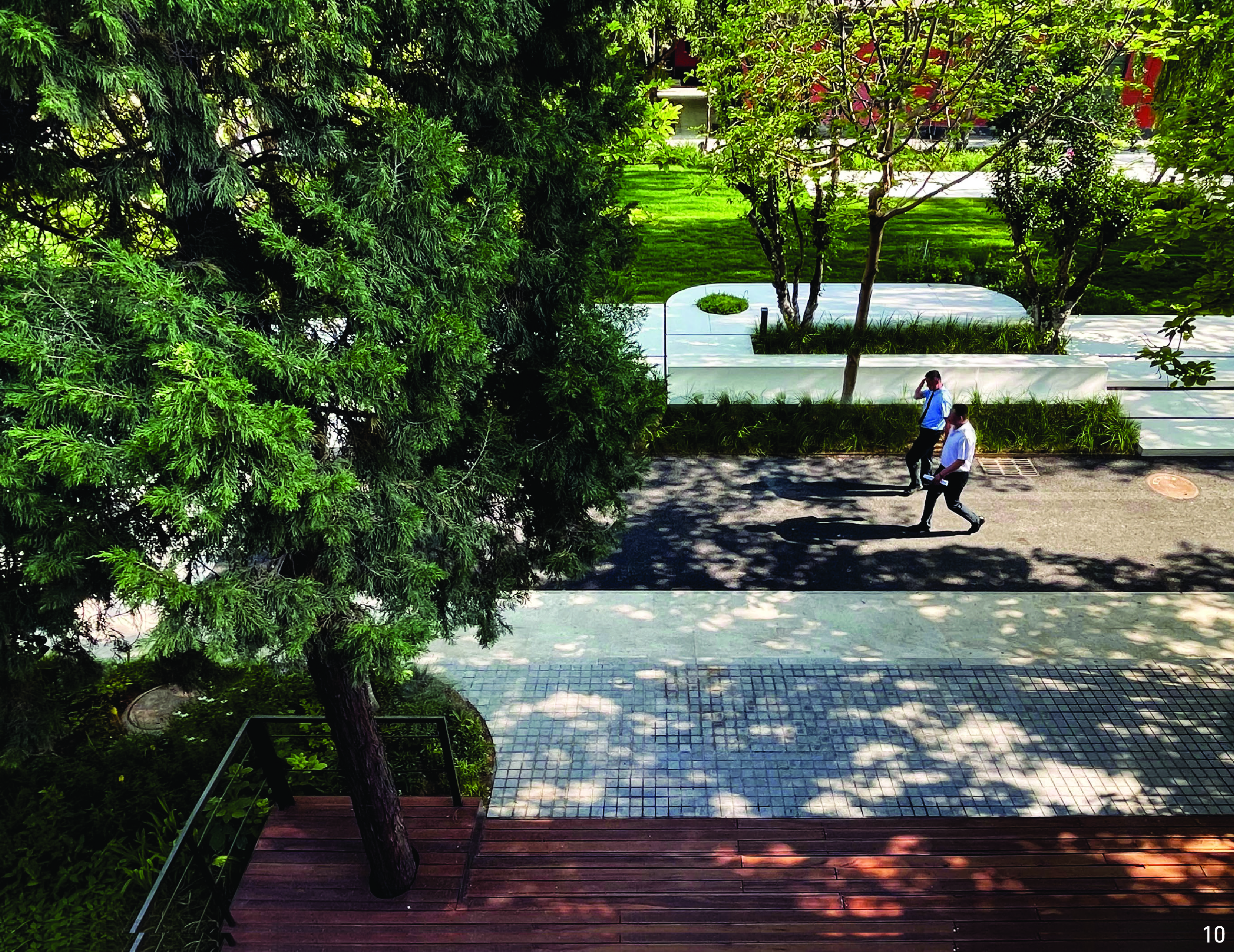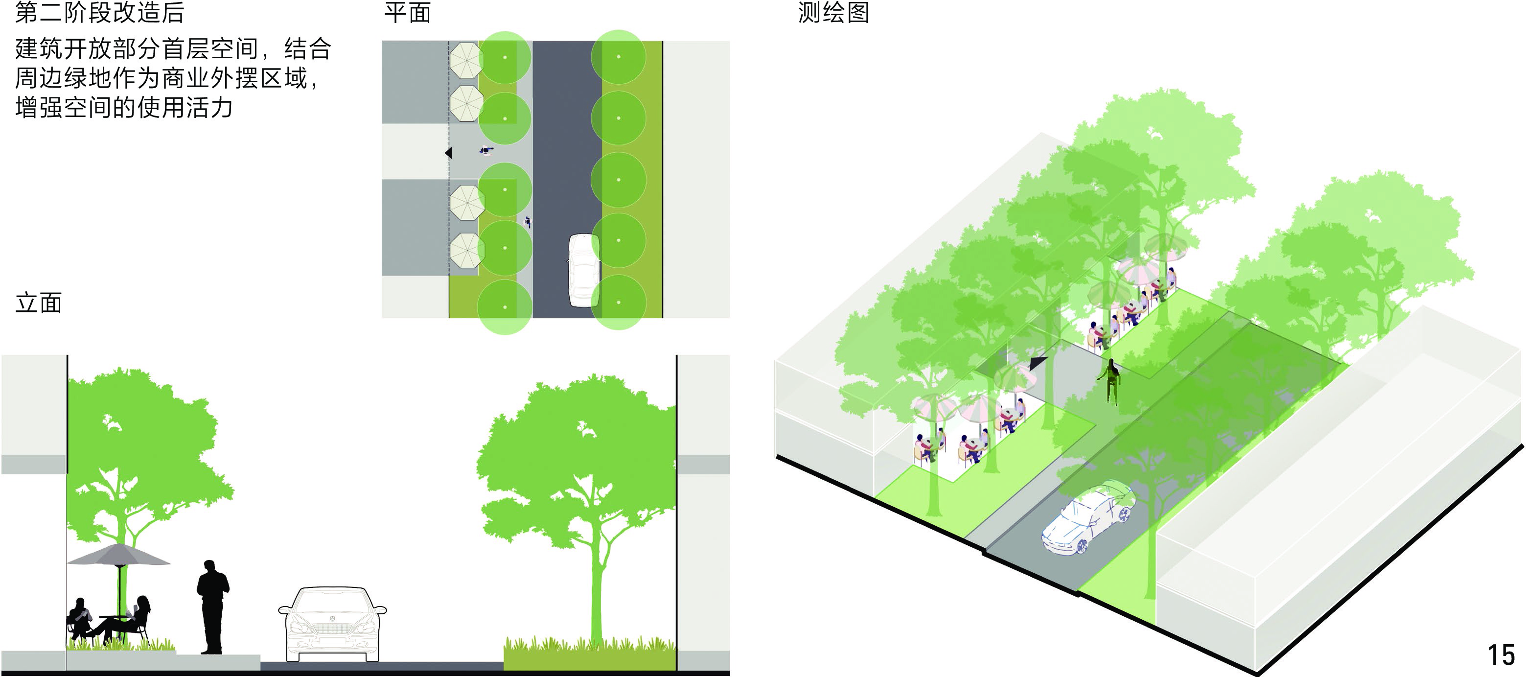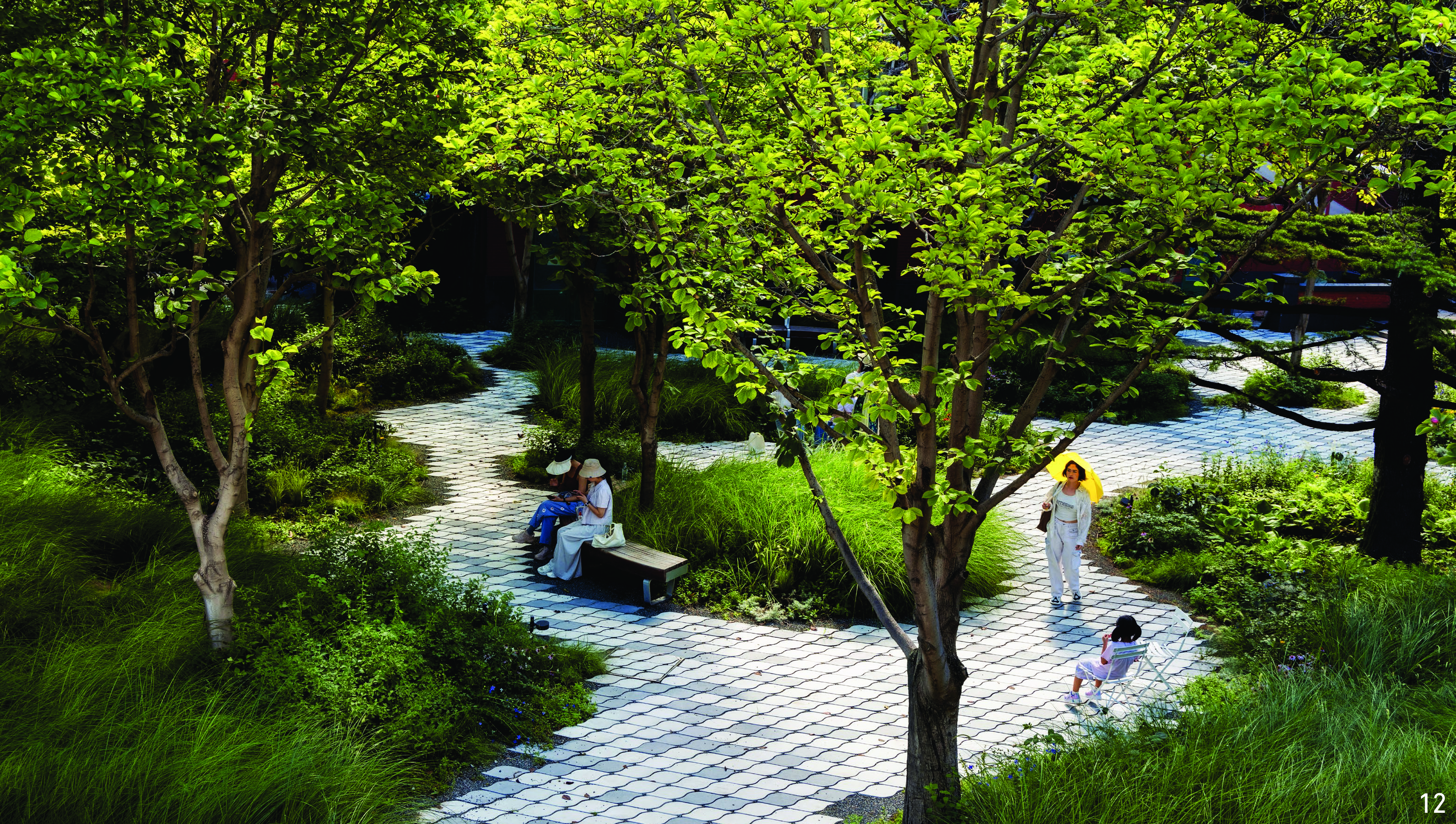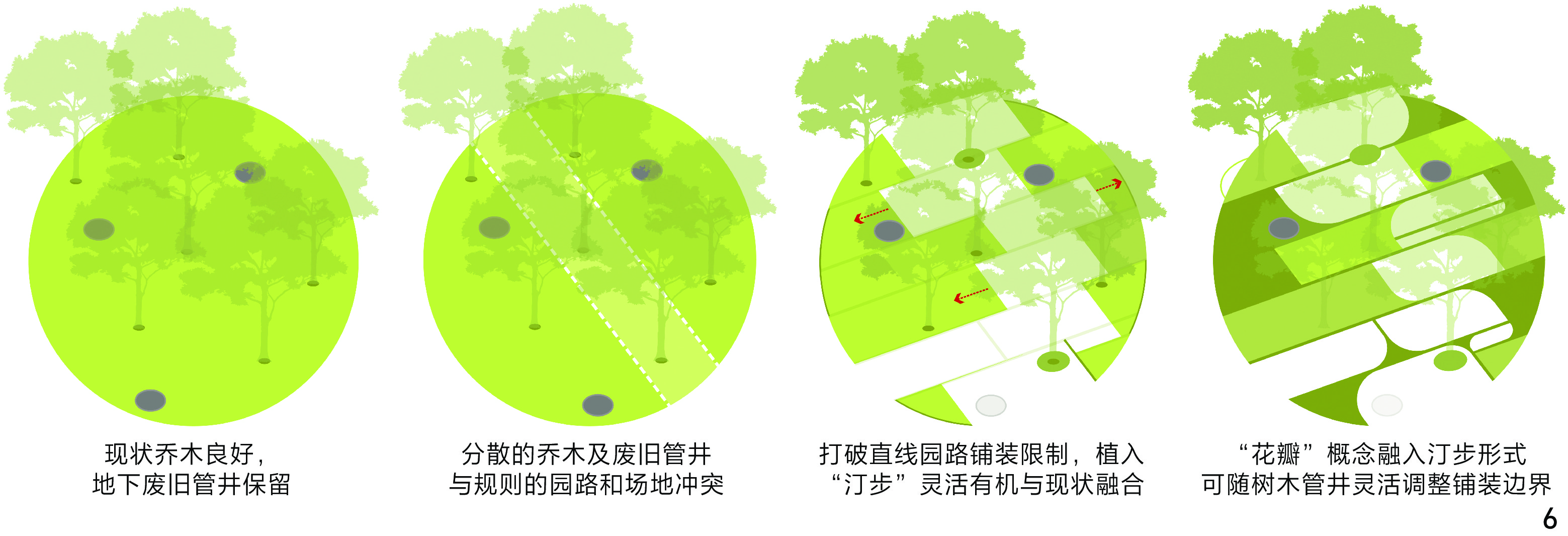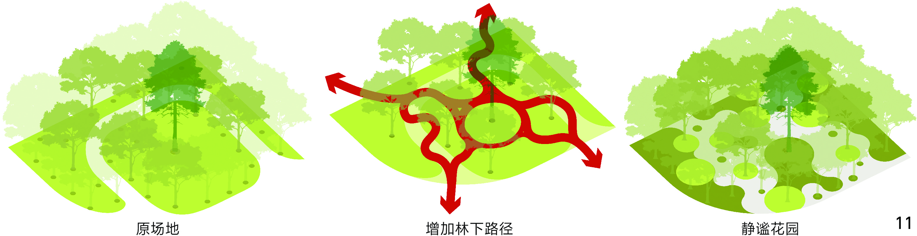 中央花园空间重构策略:连通左右两块绿化,保留所有现状乔木,打通林下空间