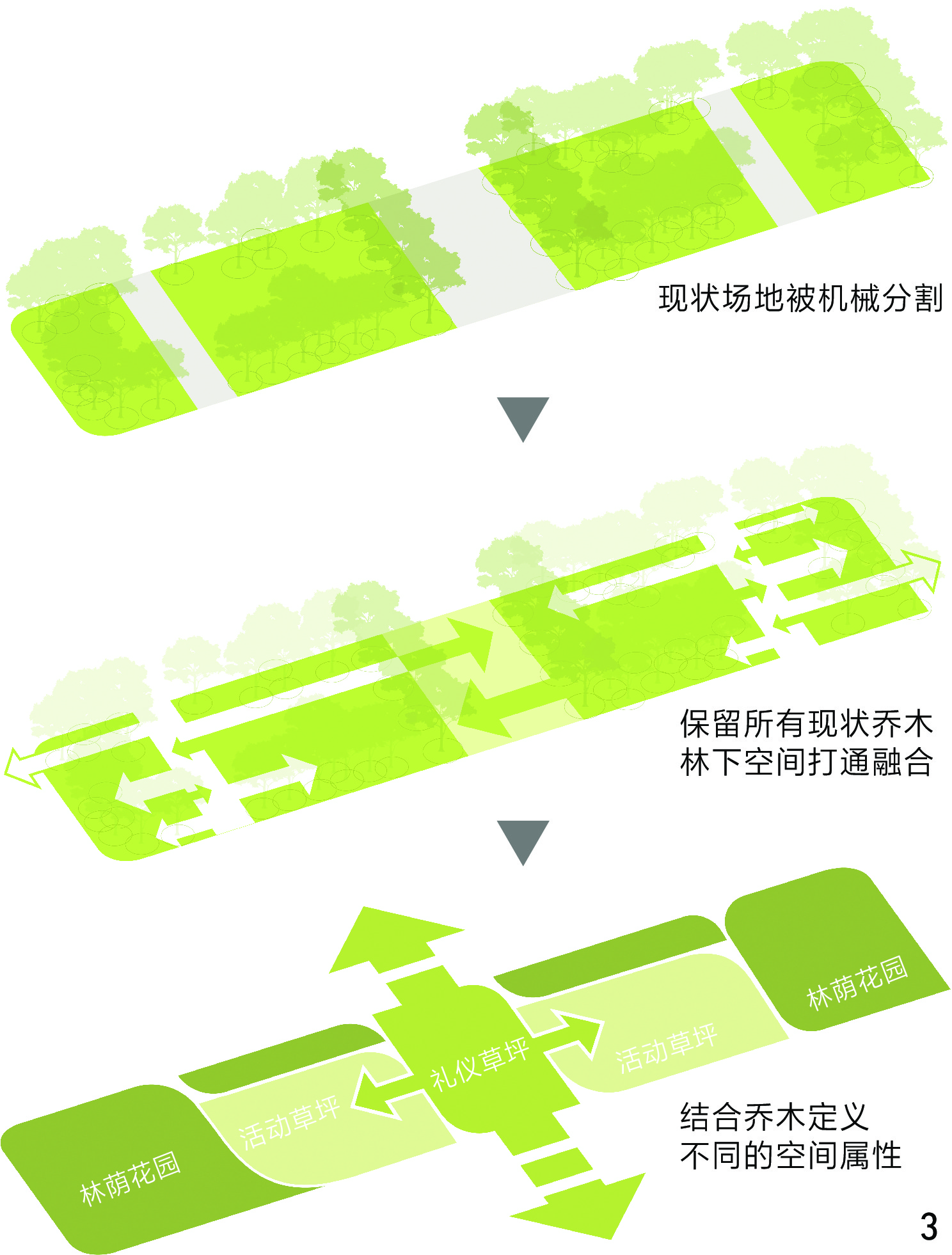 将原场地两块独立的绿化区连通,打造礼仪感入口空间